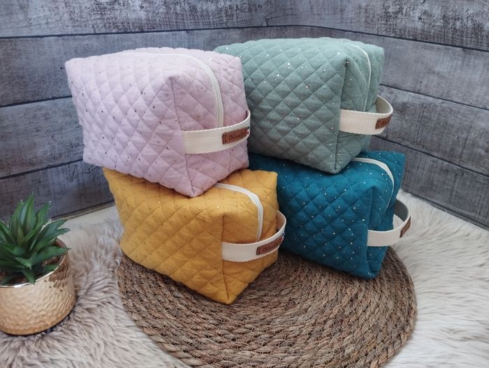 Trousse de toilette: Dimensions idéales pour mettre les couches et le nécessaire de toilette de bébé Vous pouvez aussi l'utiliser en trousse à maquillage ou trousse de voyage. L'extérieur est en double gaze de coton molletonné, l'intérieur est en coton enduit imperméable. Dimensions L19xH12xP10 Différents coloris possibles Possible également de floquer un prénom sur la trousse (+2€)