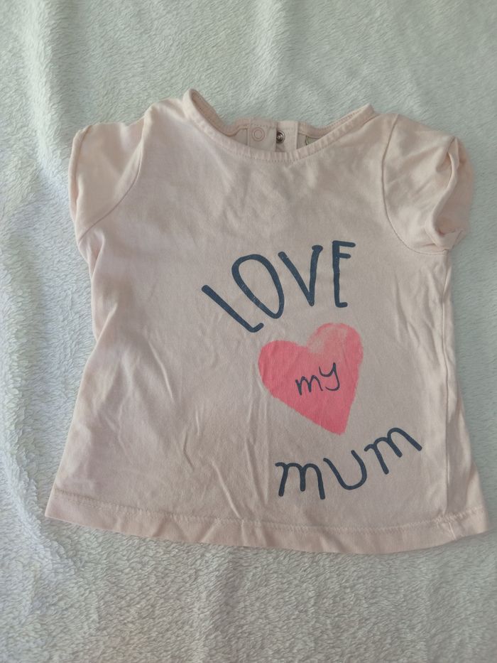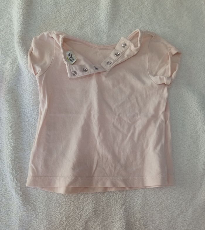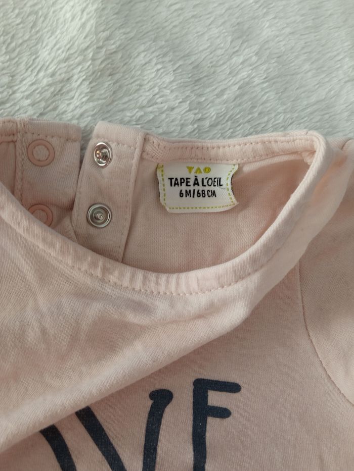 Tee-shirt manches courtes Tape à l'oeil Taille 6 mois Petite ouverture à la nuque en boutons pression Couleur rose pâle Il est en excellent état. Il s'associe très bien au short en jean de la même marque, en 6 mois, du dressing