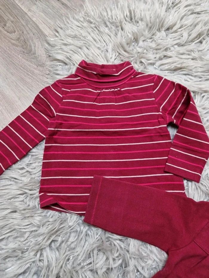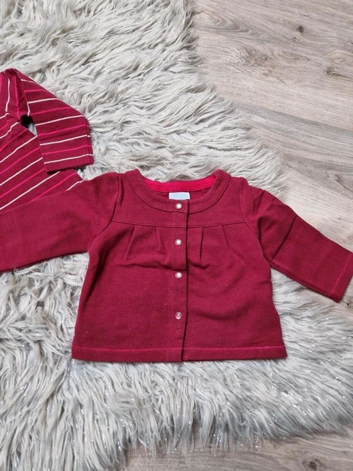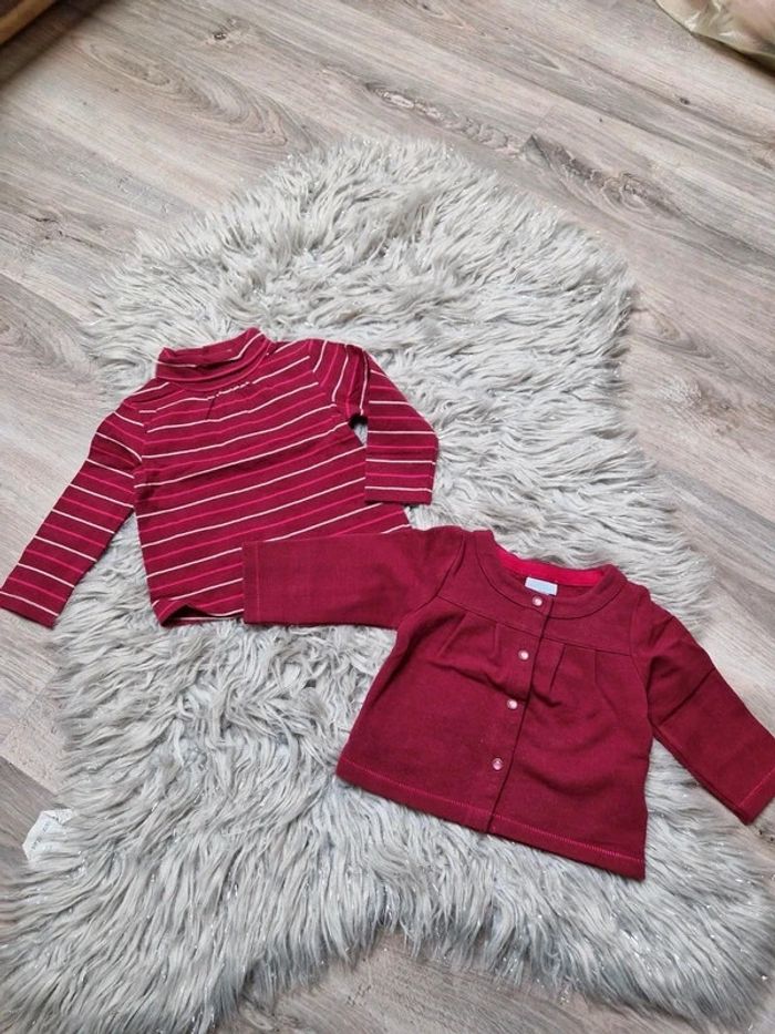 Ensemble gilet molletonné + col roulé tout doux + petite paire de chaussettes (rayées comme le t-shirt) En excellent état. Taille 3 mois.