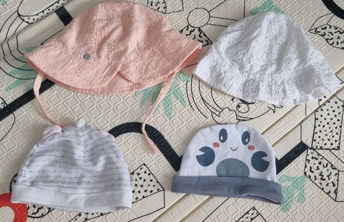 Vend 2 chapeau rose T 44 blanc T 43 2 bonnet un 6mois et l'autre 3 mois
