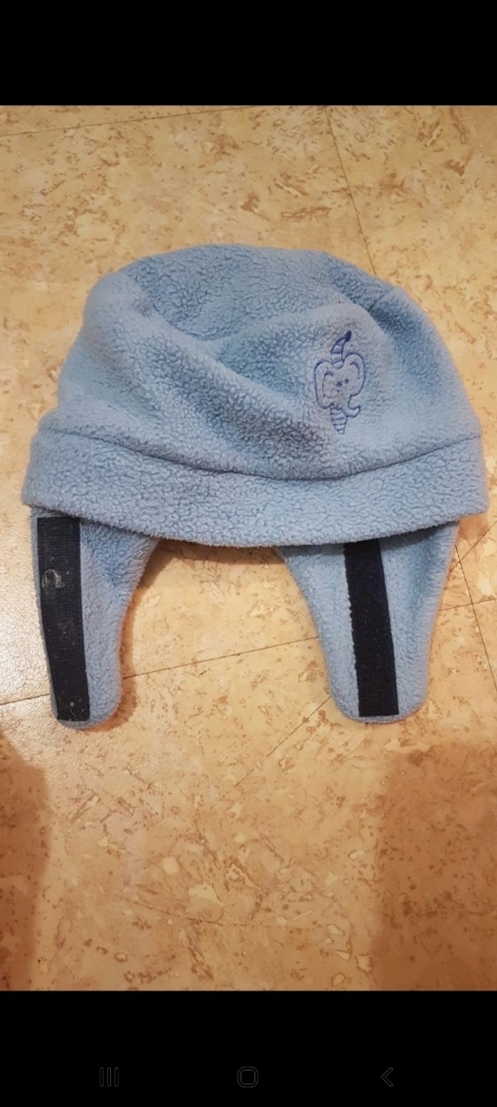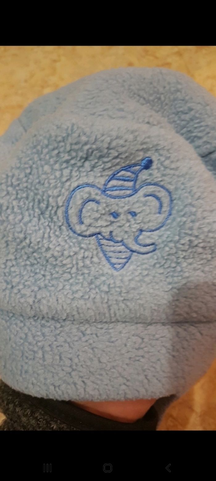 Bonnet bleu avec un dessin éléphant Dessus 100% polyester Dessous 100% coton