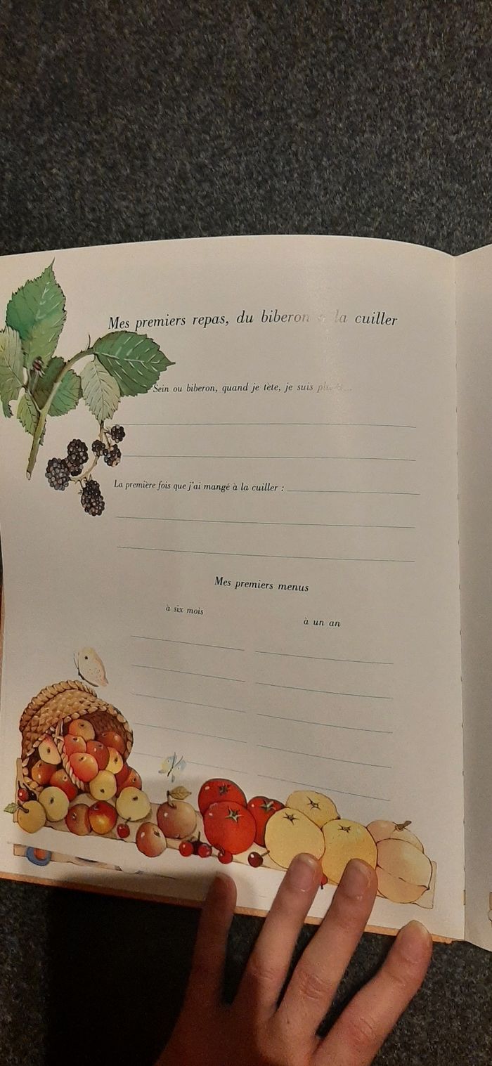 Livre de naissance de bébé. Pour ne rien oublier des premiers instants. Il y a quelques écritures (très peu) qui ont été effacées au blanco.