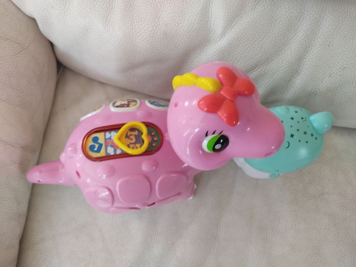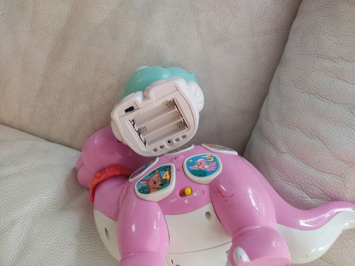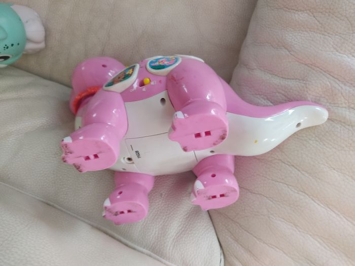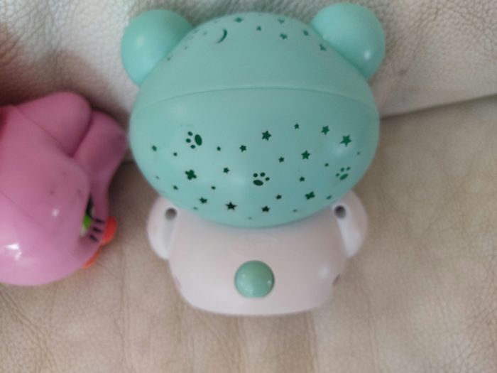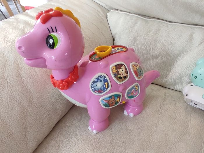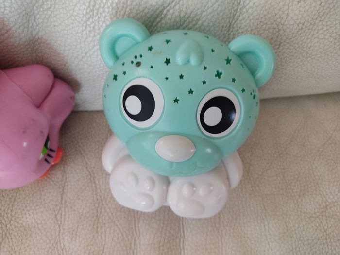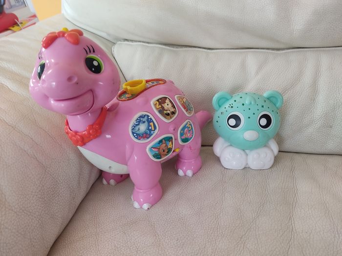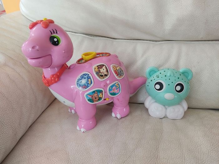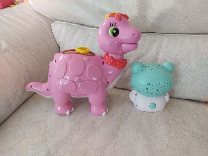 Lot: - 1 veilleuse lumineuse ourson qui projette des étoiles au plafond. Attention il manque le cache pile. Marque playgro - 1 dinosaure. Attention la partie électronique ne fonctionne plus. A utiliser comme un figure non sonore . Marque clementoni