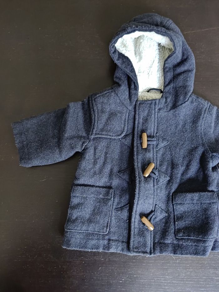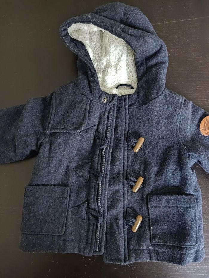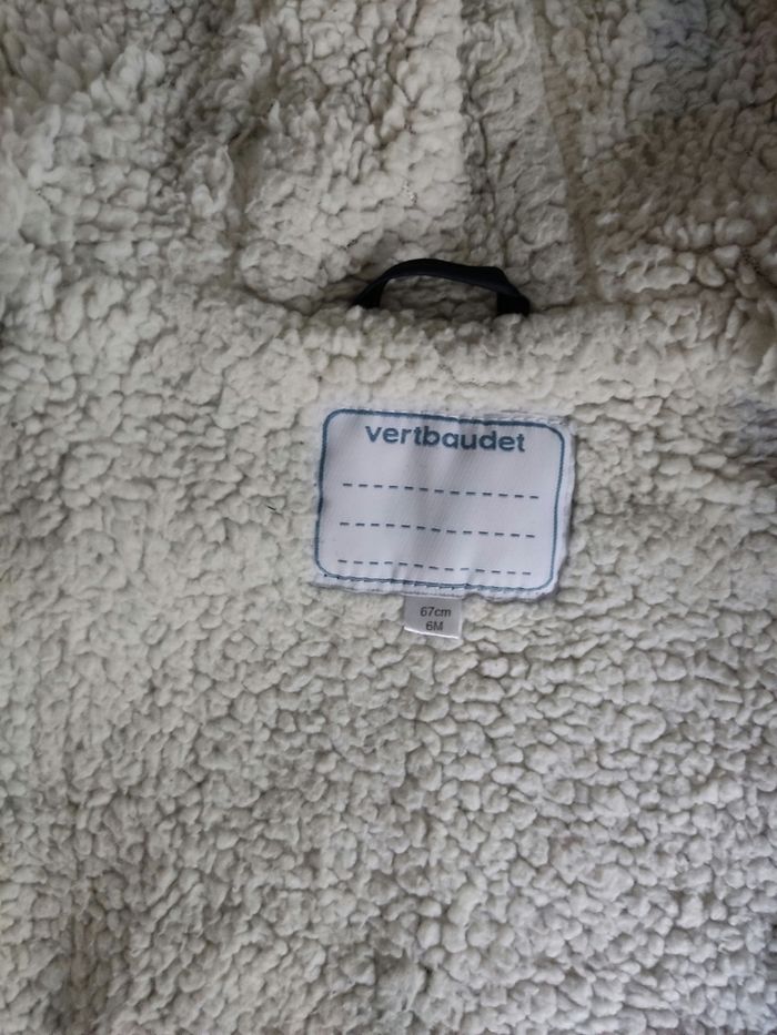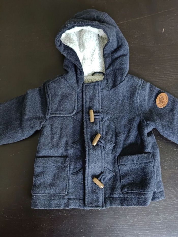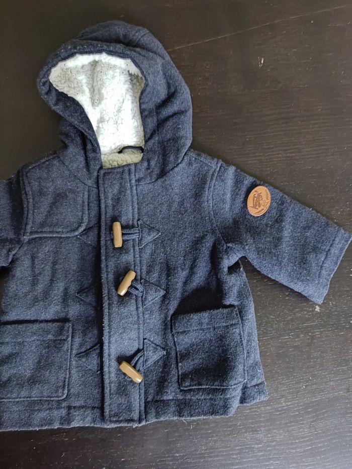 Manteau bébé avec fermeture et capuche. Colori bleu marine. Manteau déjà porté plusieurs fois. Taille: 6 mois/ 67 cm. Marque: Vertbaudet