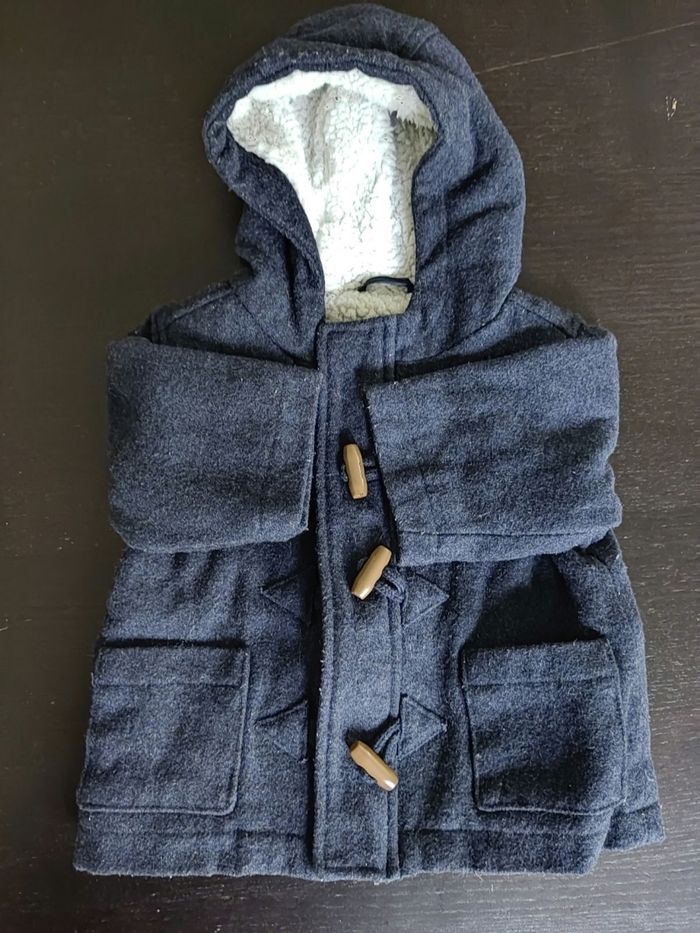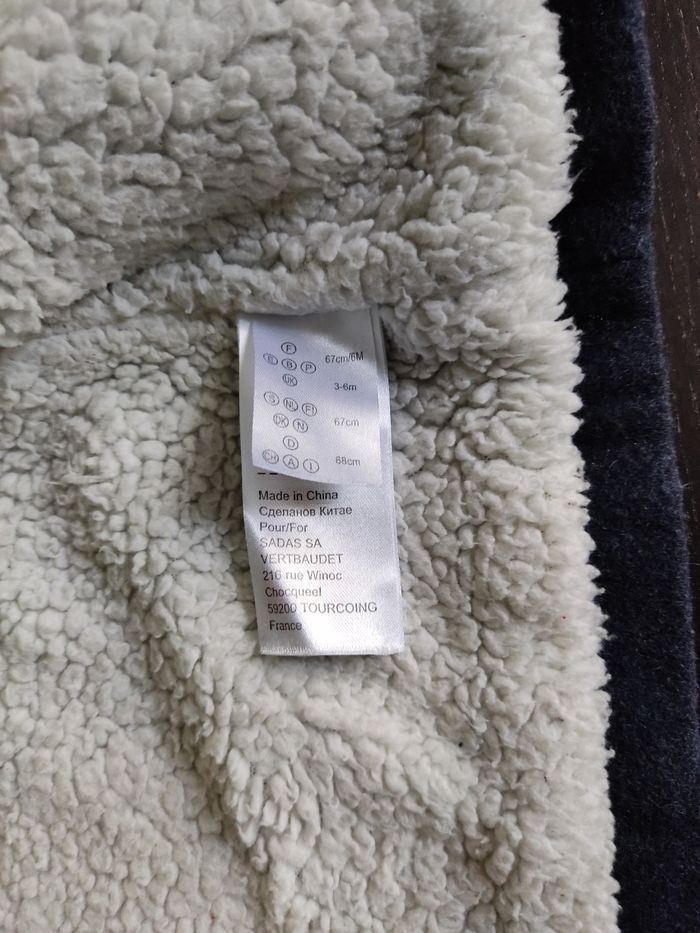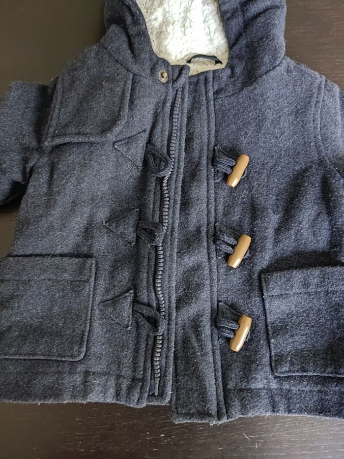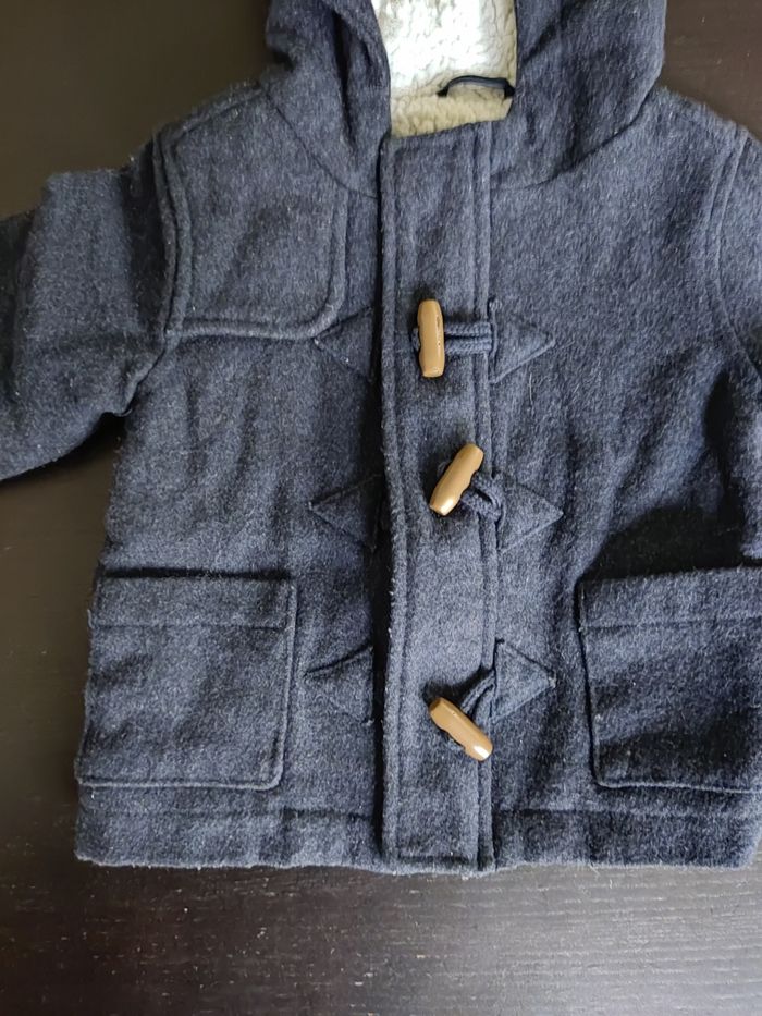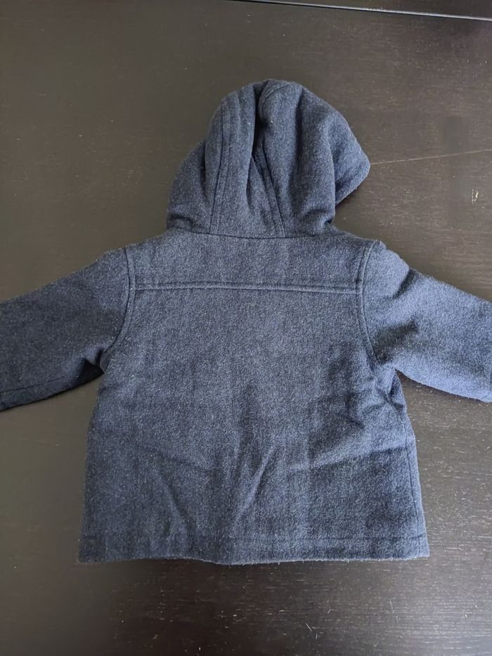 Manteau bébé avec fermeture et capuche. Colori bleu marine. Manteau déjà porté plusieurs fois. Taille: 6 mois/ 67 cm. Marque: Vertbaudet