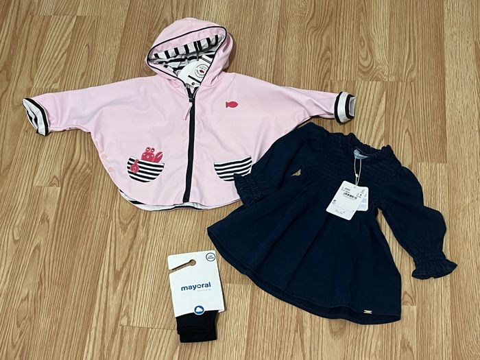 Ensemble composé d’un ciré taille 6 mois week end à la mer, d’une robe Mayoral taille 6 mois et d’une paire de collant Mayoral taille 3/6 mois