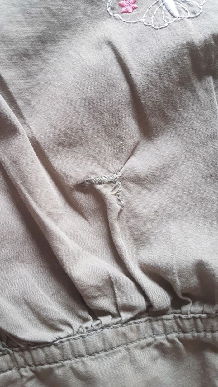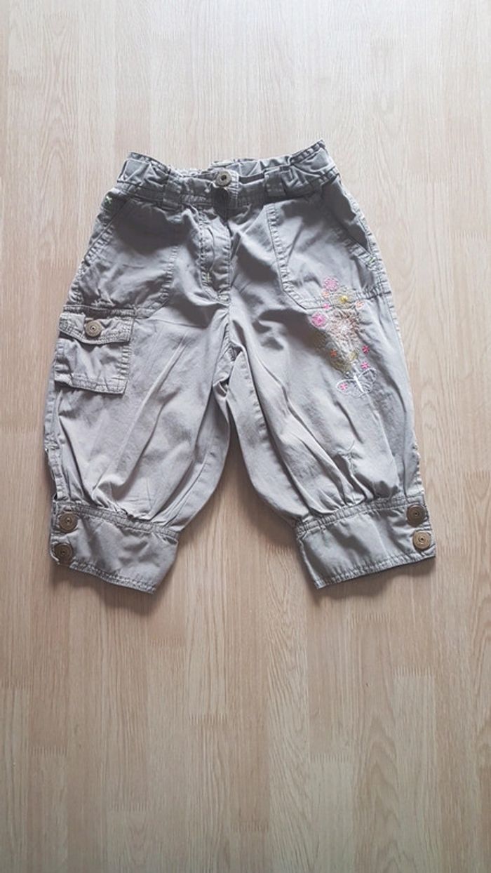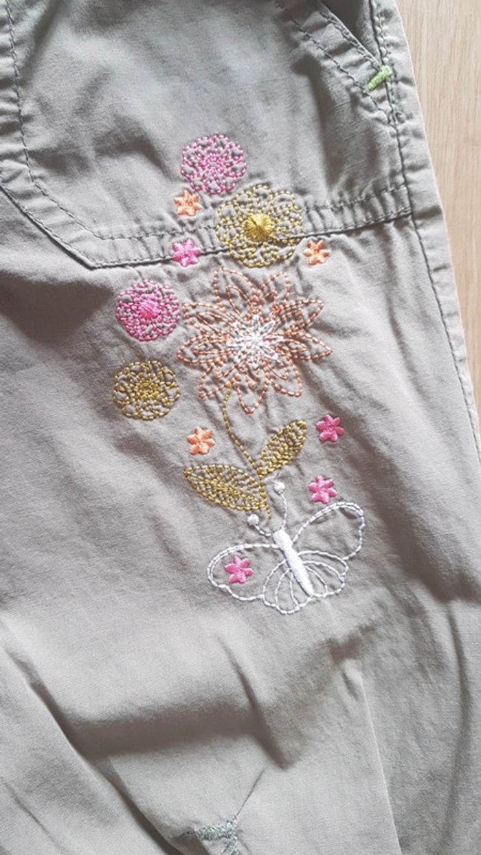 Pantacourt avec motifs brodés. Un accroc a été racomodé sur le devant comme montré sur la photo. Ajustable à la taille avec elastique er boutons #cat78440_5ans_fille