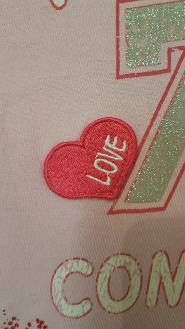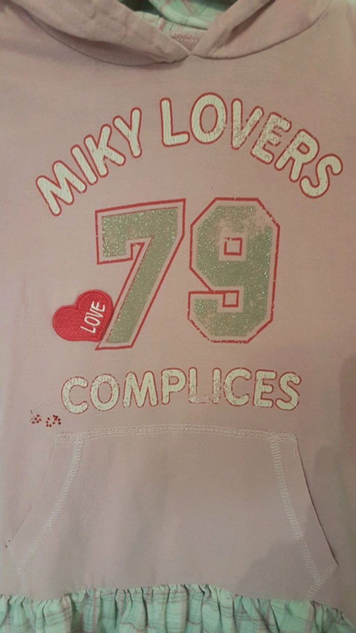 Robe à capuche avec poche kangourou, 79 à paillettes, coeur en relief. Écritures un peu abîmées mais cela peut paraître fait exprès. Petits accroc à la limite de la poche kangourou #cat78440_6ans_fille