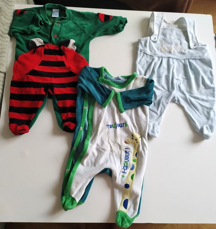 Je vends 11 pyjamas bébé, taille 3 mois. Certains sont neufs, d'autres bien portés mais aucun trou, en super état. J'en donne un 12eme qui est taché de lait maternel, il est cependant en bon état. Tous en velours sauf 1 en polaire et un autre en coton épais, idéal pour bébé d'automne hiver.