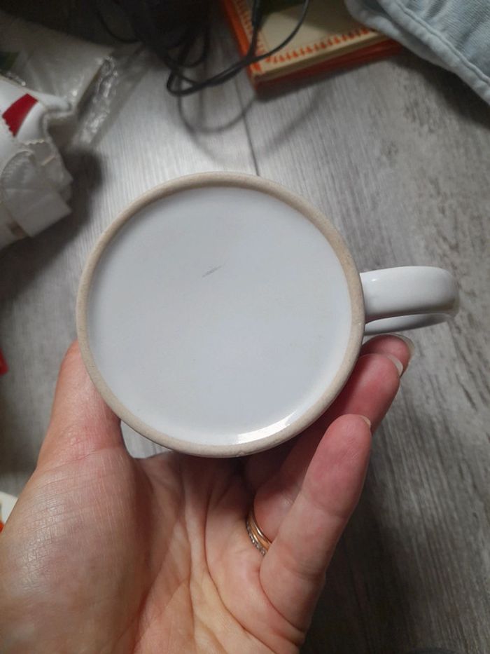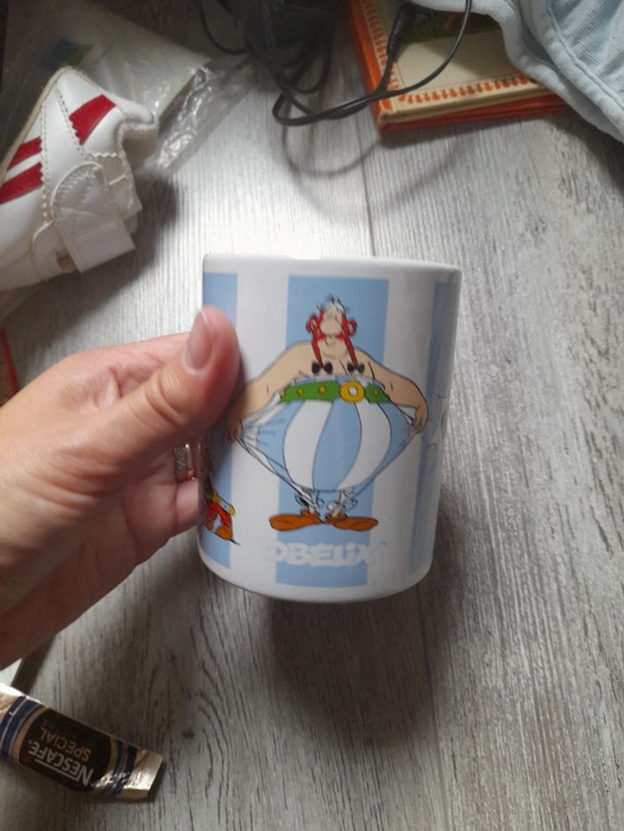 Bonjour Je vends un mug tasse Astérix Quick. En très bon état mais à l'intérieur il y a une tache noir au fond qui ne part pas voir photos