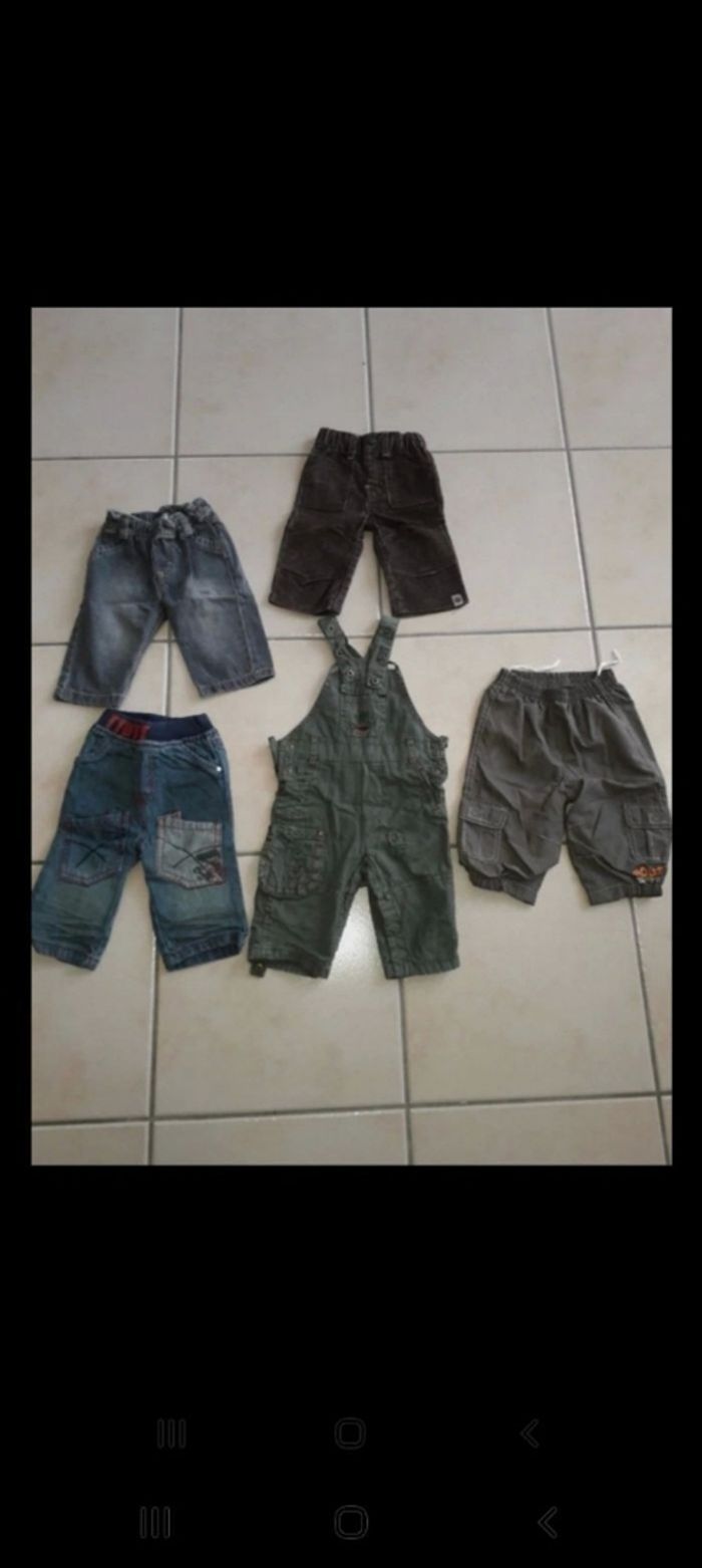 Lot comprenant : 1 salopette, 2 jeans et 2 pantalons en parfait état taille 6 mois