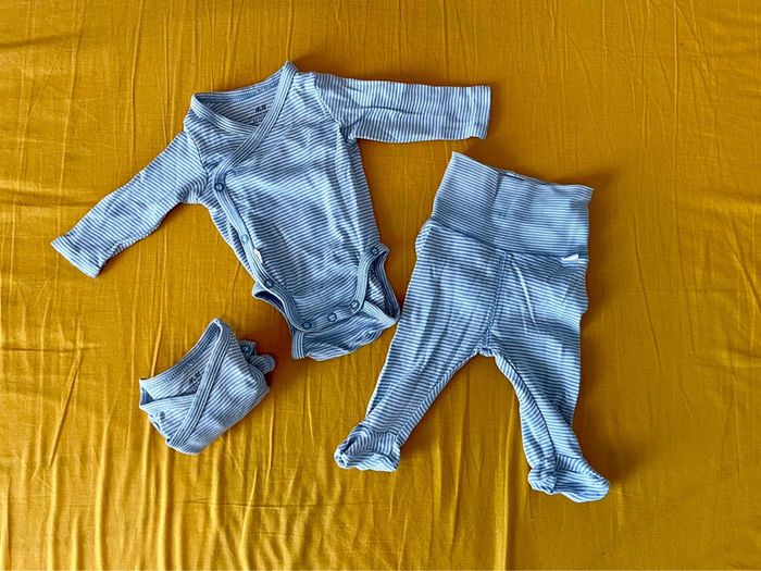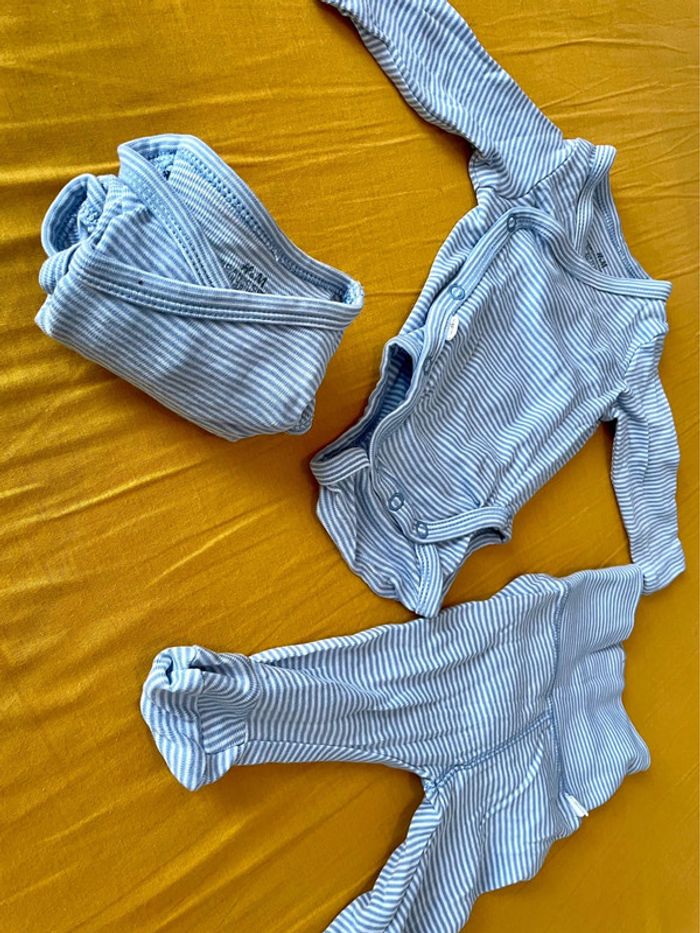 Ensemble à rayure bleu. Taille 1 mois de chez H&M. Lot de 2 bodies ML + pantalon. Très bon état.