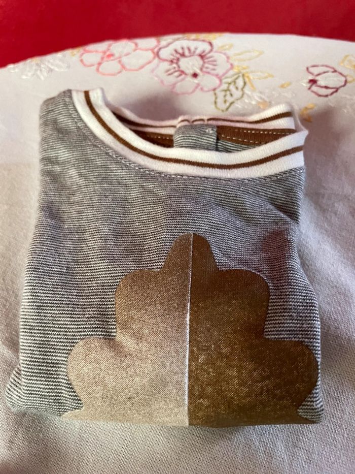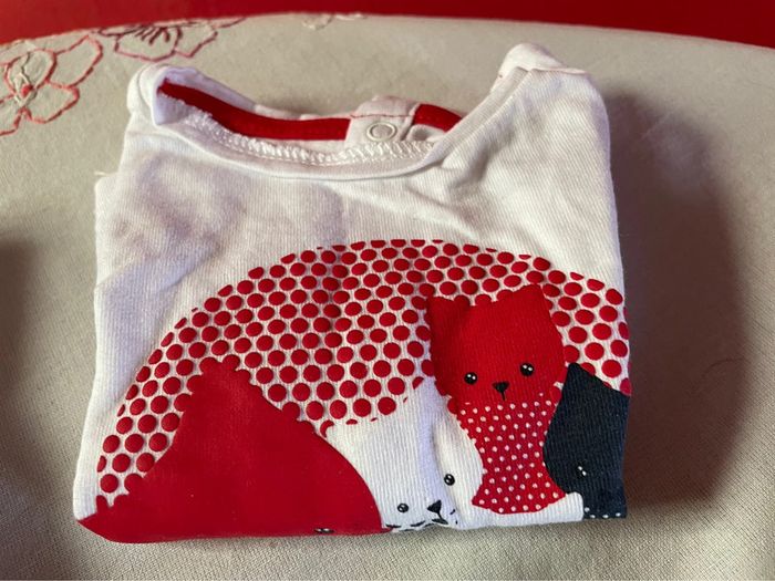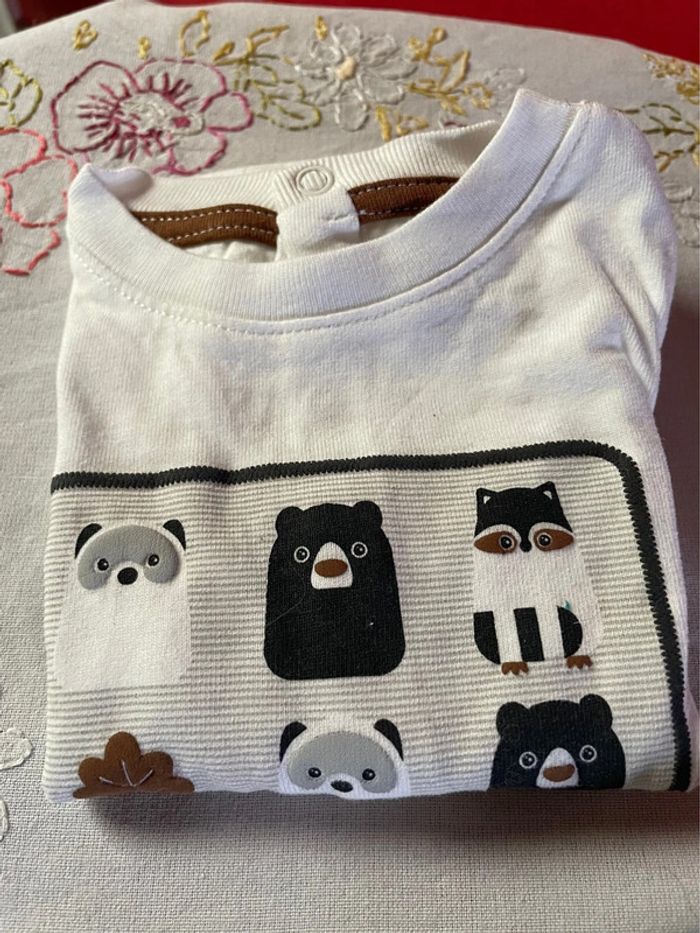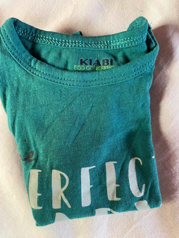 Lot de 4 tee-shirts. 3 manches longues Obaïbi. 1 manche courte Kiabi. (Le bleu) Taille 1 mois. Parfait état.
