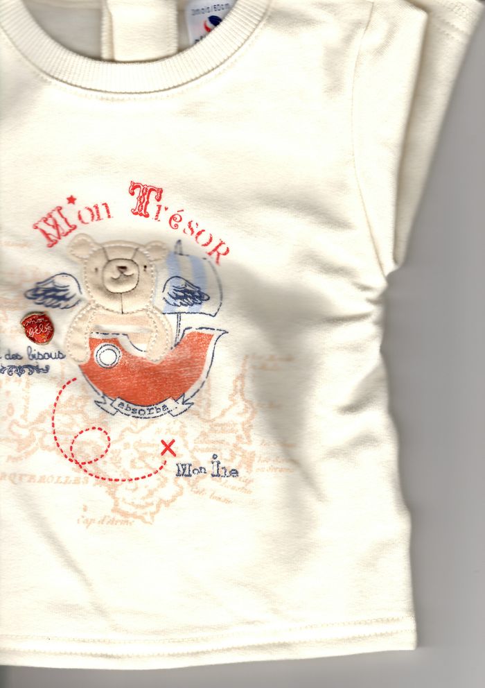 motif ourson, inscriptions : mon trésor mon île roi des bisous mon bébé, 96% coton 4% élasthanne, fermeture dos boutons pressions, très peu porté