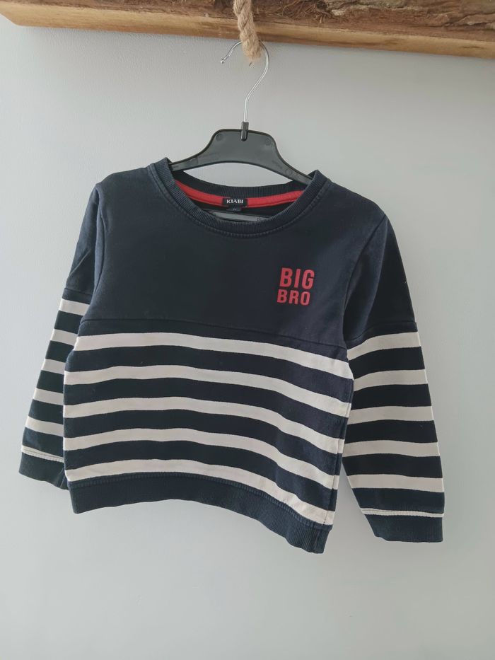 ❄️ Préparez l'arrivée du froid ❄️ Lot de 2 sweat-shirts : - marinière, avec message "Big Bro" - kaki, col camionneur et poche kangourou Taille 5 ans Très bon état, aucune tâche