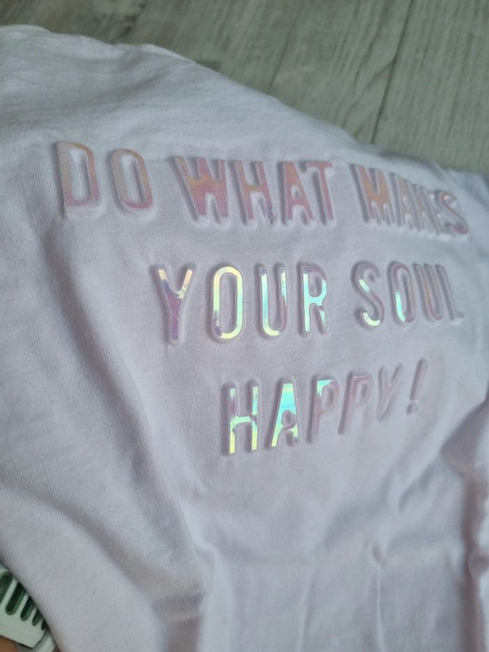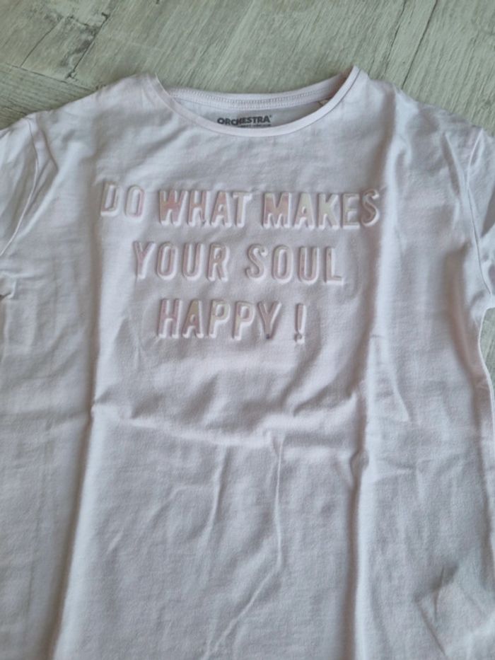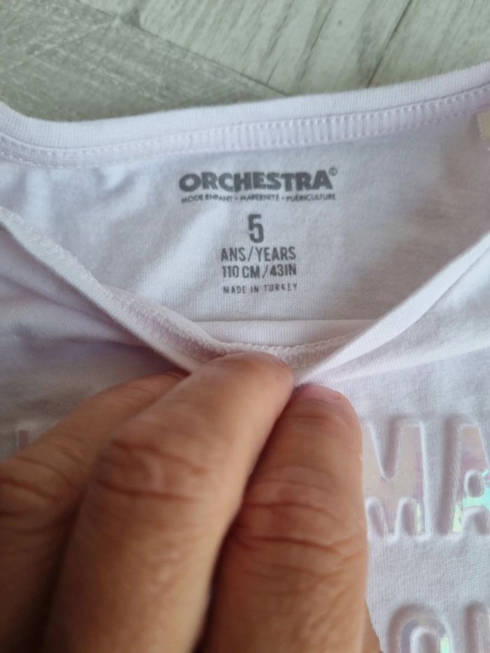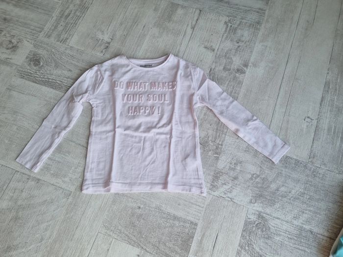 Tee-shirt manches longues Taille 5 ans Très bon état L'inscription est en relief et brille La couleur est rose poudrée Marque Orchestra