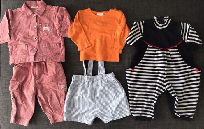 lot de vêtements pour garçon taille 12 mois / 1 an -1 ensemble pantalon et veste-chemise -1 tee shirt à manches longues -1 short à bretelles -1 combinaison sans pied occasion, état satisfaisant