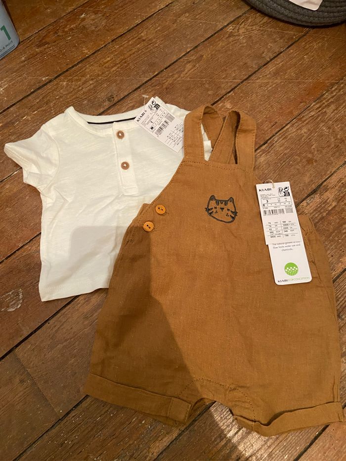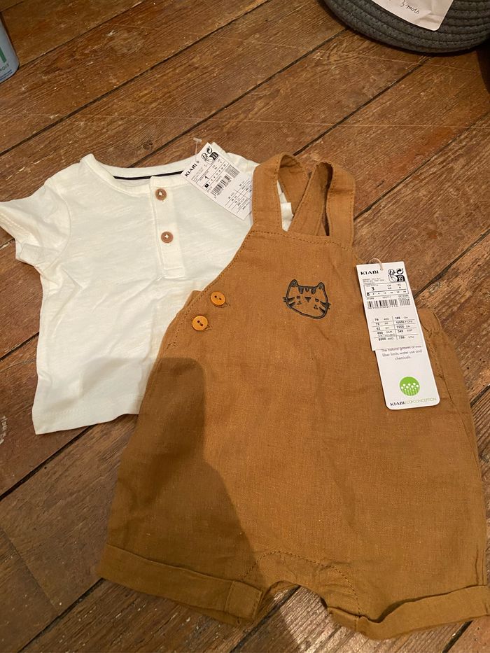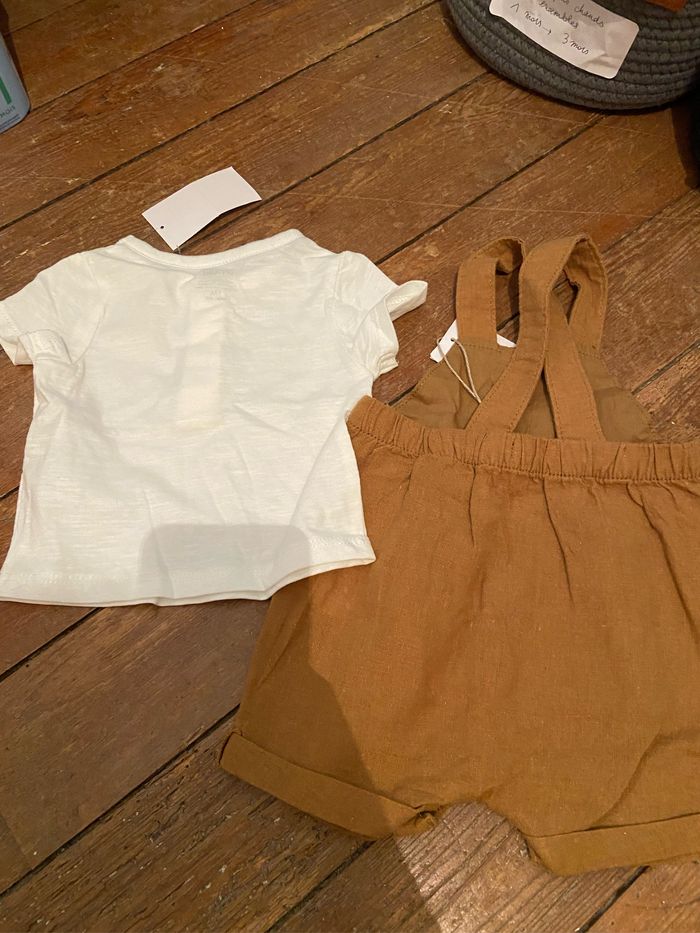 Salopette en lin 3 mois et tee shirt coton 1 mois, neuf avec étiquette