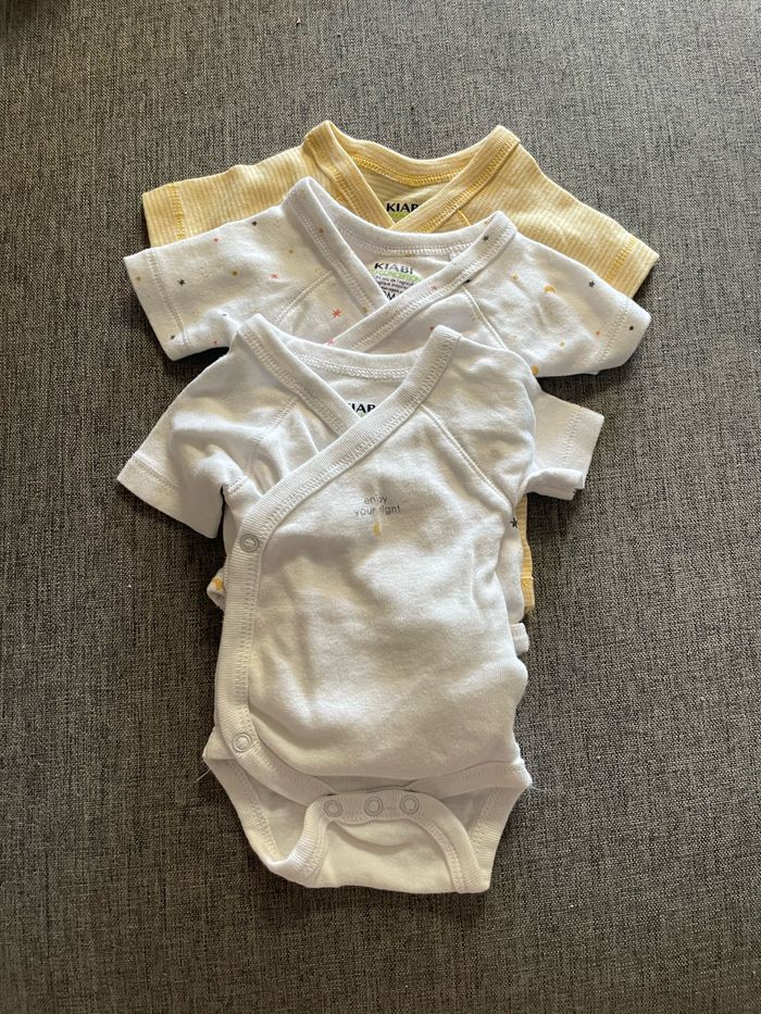 Lot de 3 bodies manches courtes taille 0 mois de la marque kiabi sur le thème des étoiles, très bon état, très peu portés, unisexe