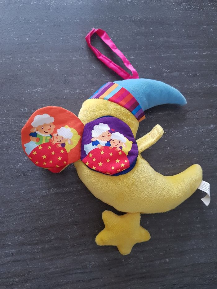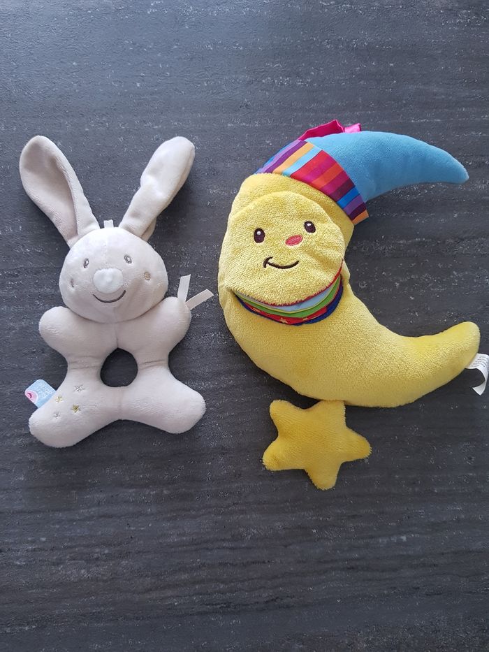 Lot comportant : - un hochet lapin Sucre d'orge en très bon état qui n'a pratiquement pas été utilisé - une lune musicale avec un mini livre intégré en très bon état. Fonctionne toujours pour la musique. Tout a été lavé et testé pour la vente.