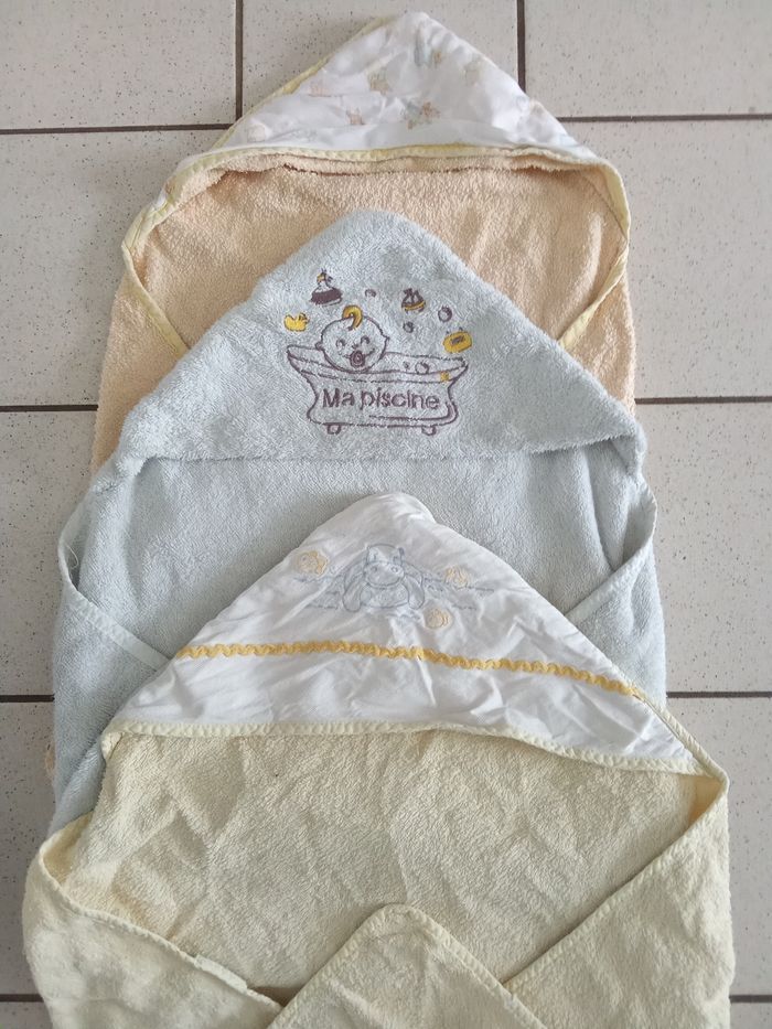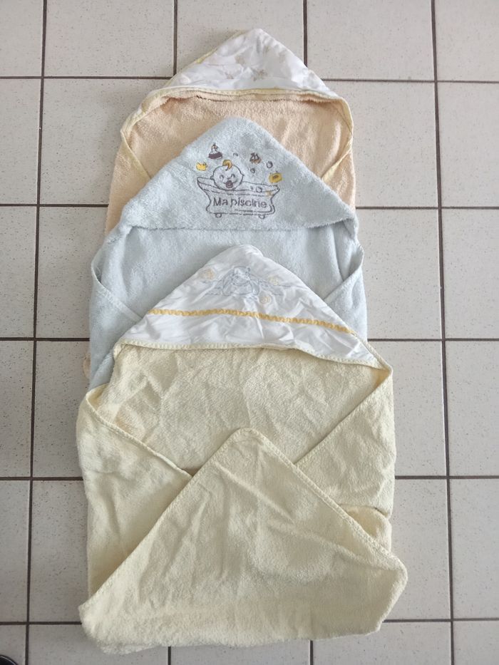 Lot de 3 sorties de bain pour bébé éponge, 1 jaune, 1 blanche plus épaisse et 1 couleur orange, differentes marque et coloris. 📌Pas récente mais peuvent encore dépanner.... 🎈 1 autre sortie de bain ainsi qun peignoir Winnie également à vendre Beaucoup d'autres accessoires bébé : liniment , peigne neuf, bavoirs, tire lait etc...également à vendre ds mon dressing et réduction activée. .