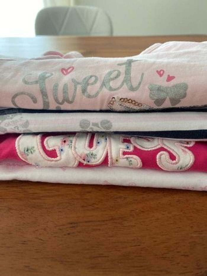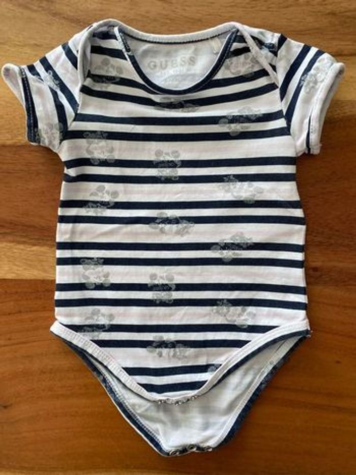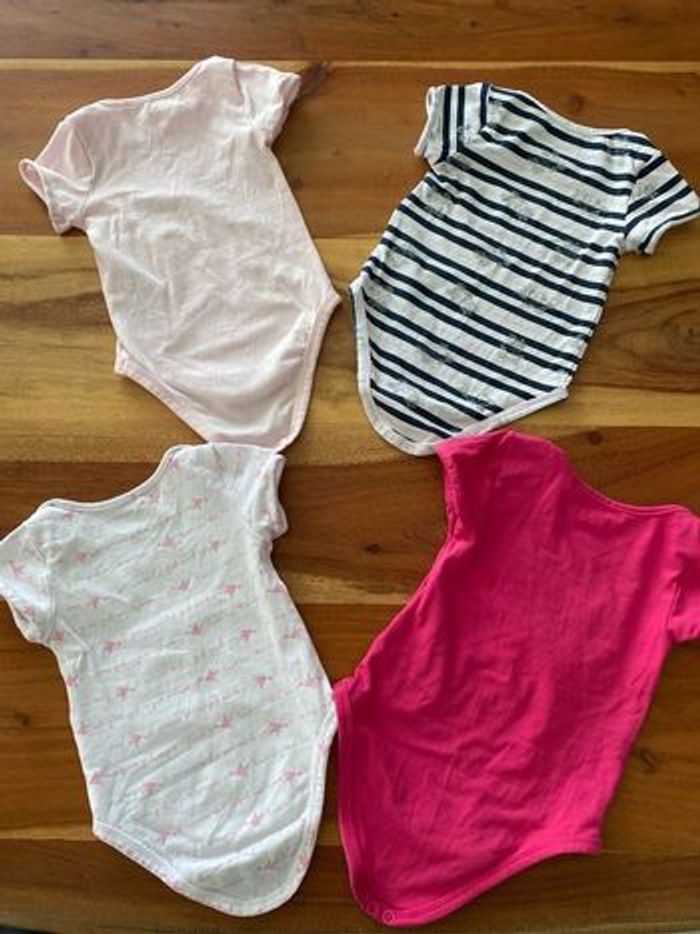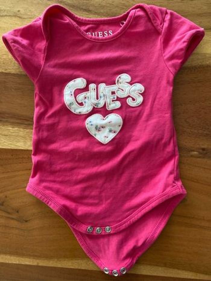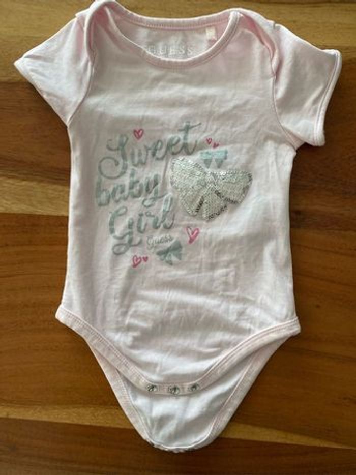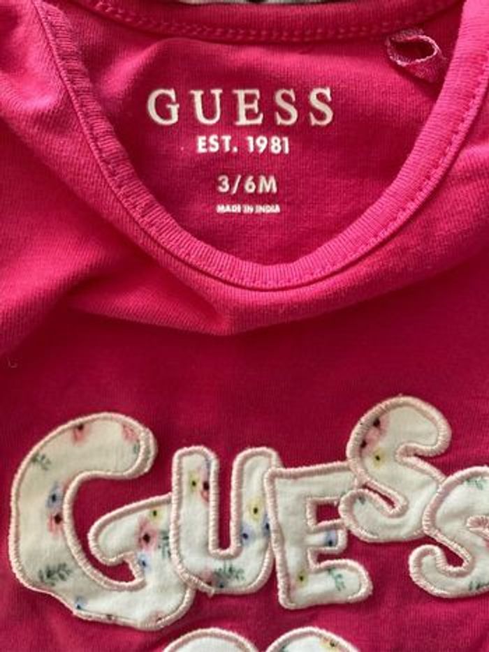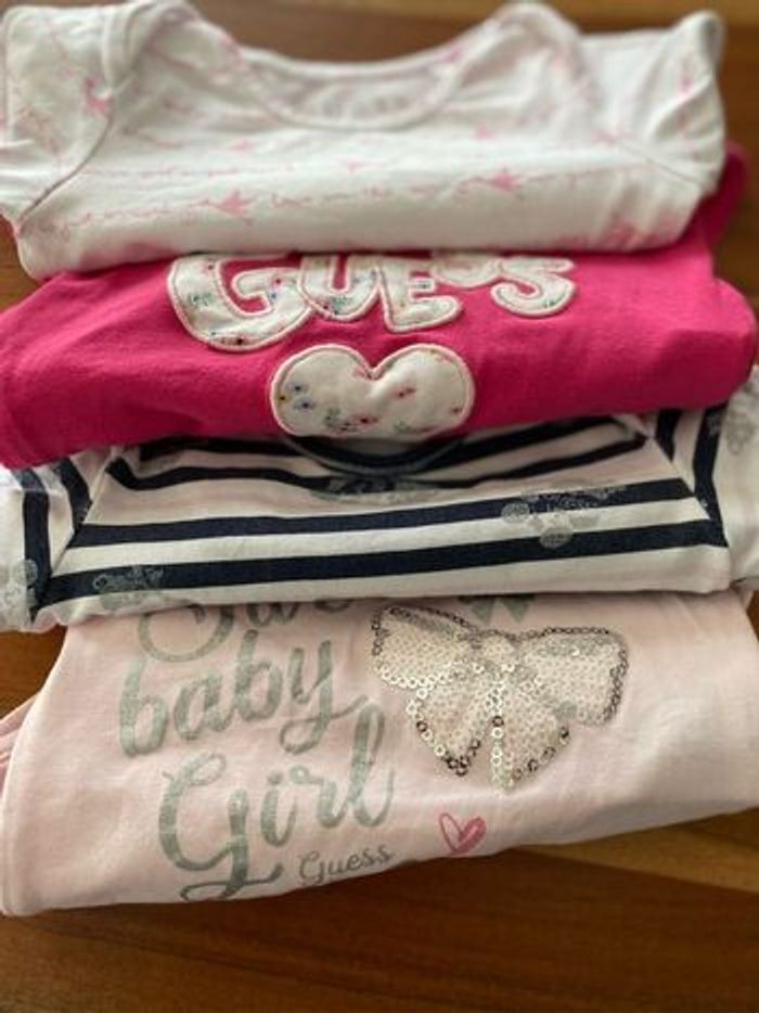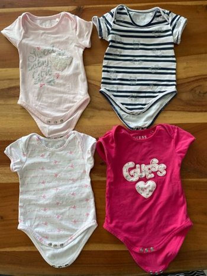 Lot de 4 bodies GUESS fille quasi neufs. Très peu portés, pas tâchés ni abîmés. 3/6 mois, manches courtes. 95% coton 5% elasthane pour un rendu stretch.