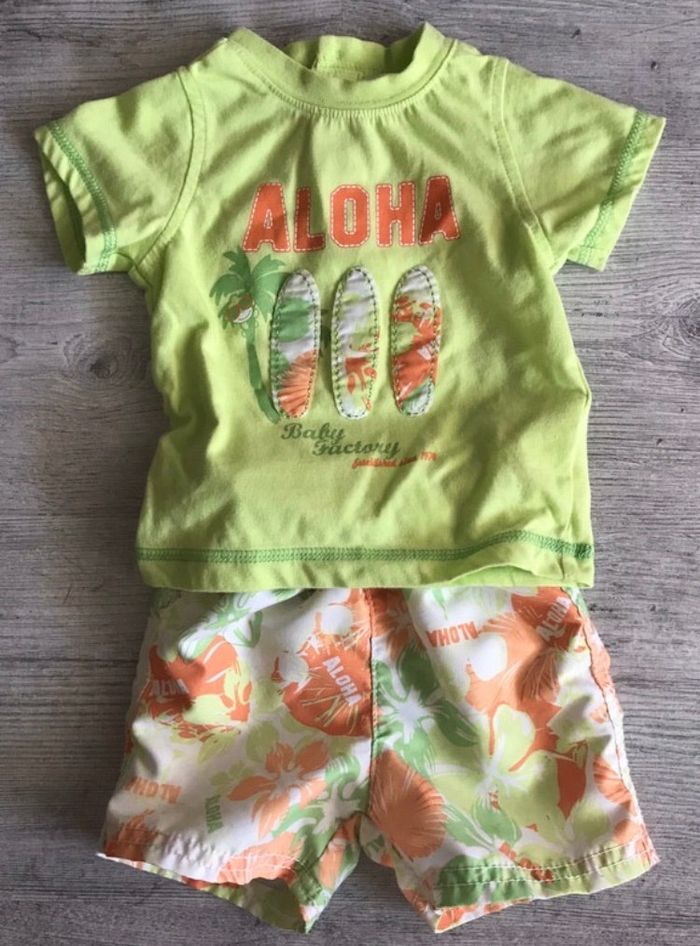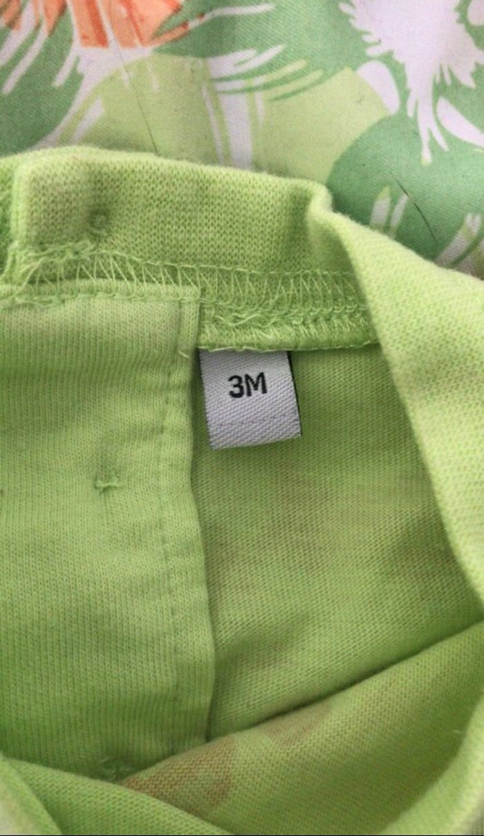 ensemble short et tee shirt taille 3 mois couleurs vert et orange défaut de fil dans le tissu du short (voir photos) occasion, bon état