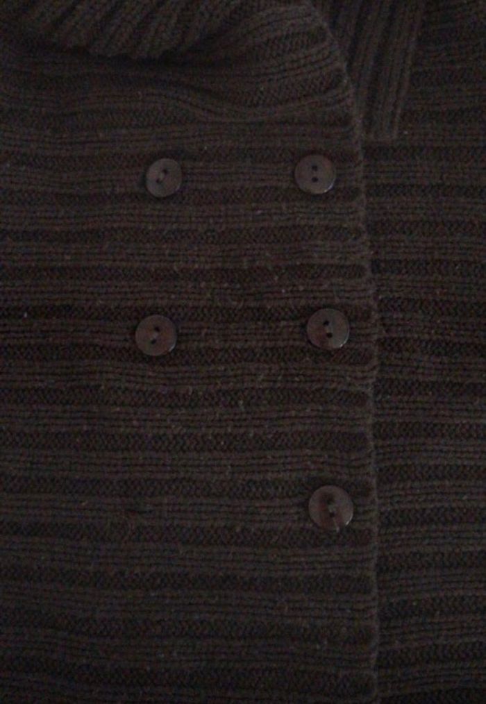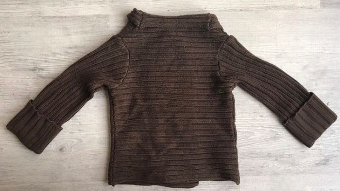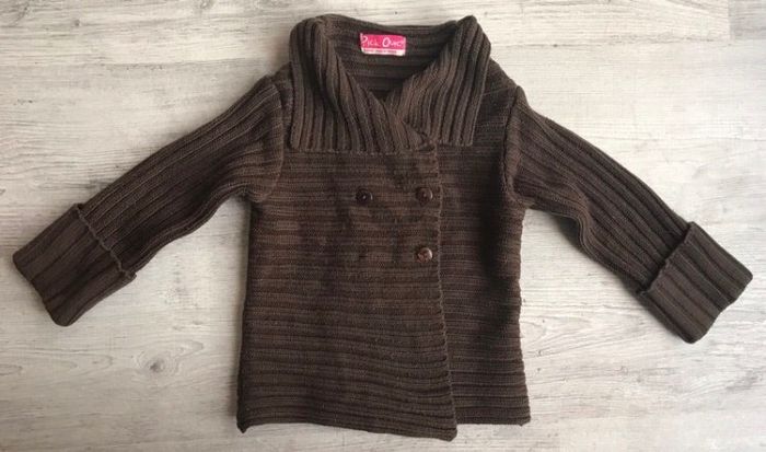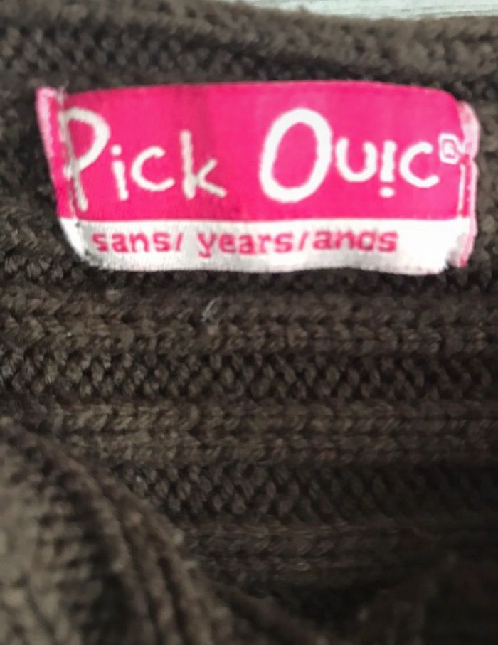 gilet légèrement croisé de la marque Pick Ouic taille 5 ans couleur marron il manque un bouton sur le bas (voir photos) présence de bouloches occasion, état satisfaisant