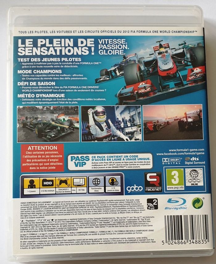 Jeu PS3 FORMULA 1 - 2012 A PARTIR DE 3 ANS DANS LA BOITE D'ORIGINE