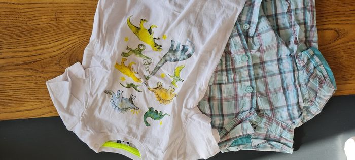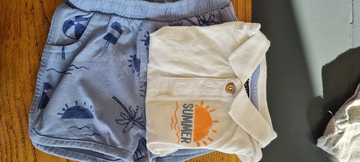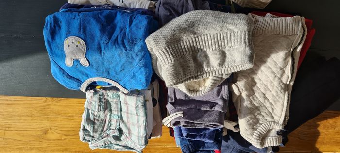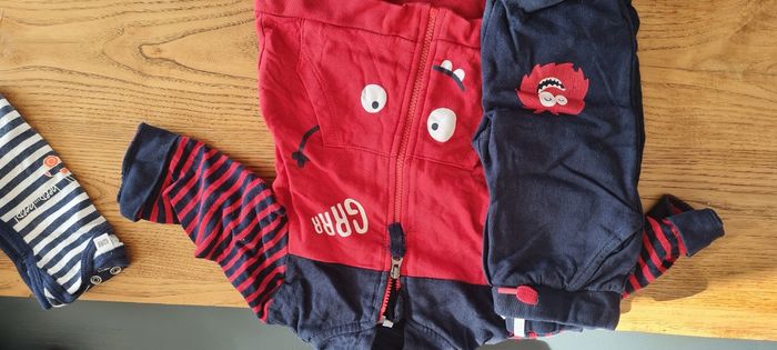 Lot vêtements bébé 6 mois garçon • 1 manteau chaud • 3 pyjamas (1 chaud 1 pièce, 1 chaud 2 pièces, 1 léger 1 pièce) • 3 bodies manches longues • 4 bodies sans manches • 3 t-shirt • 4 t-shirt manches longues • 1 cagoule chaude • 9 pantalons • 1 salopette short • 1 short • 2 Vestes