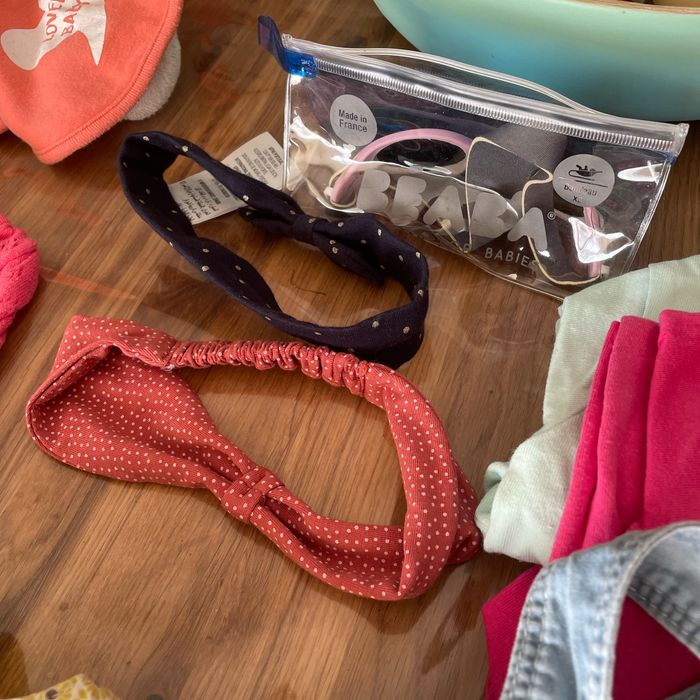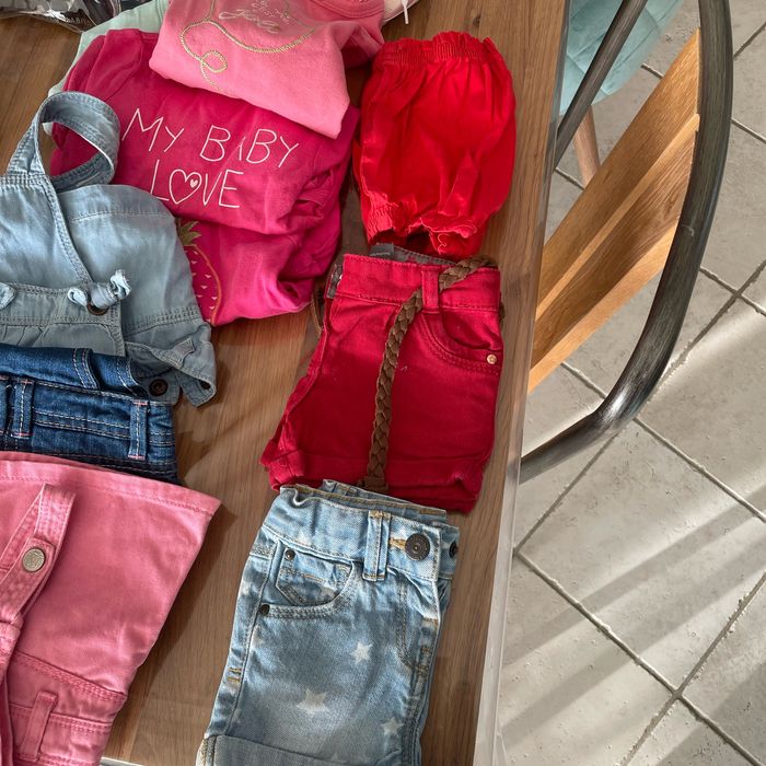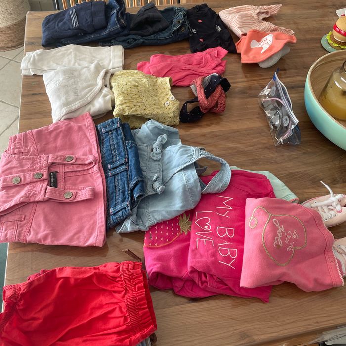 4 pantalons 1 legging 1 Blouse 3 salopettes jupe 3 short 2 haut manches courtes Une paire de lunette béaba 2 bandeaux 3 petites paires de chaussures 4 pyjamas 1 gilet Différentes marques et le tout en très bon état