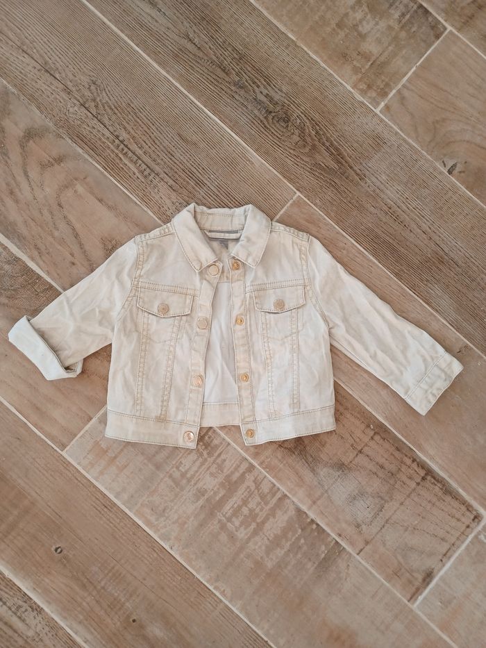 Effet métallisé beige. Taille petit. Je dirai plutôt 9 mois. Taille 80 cm.