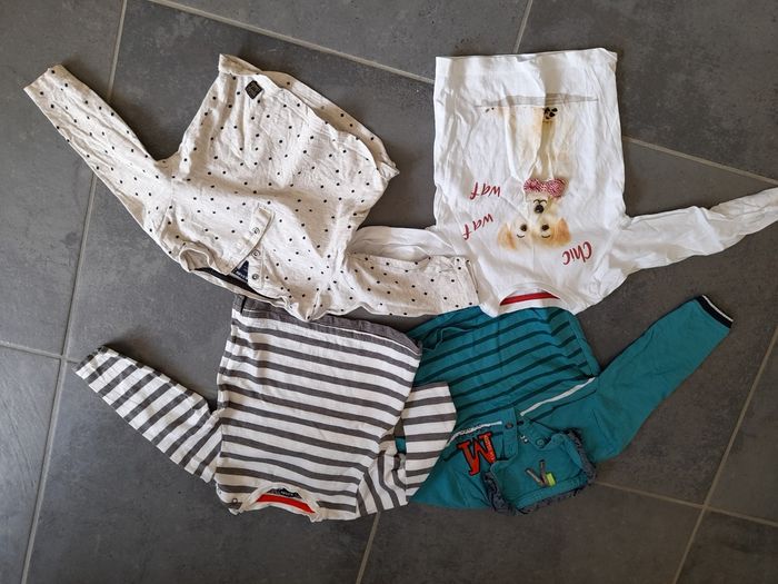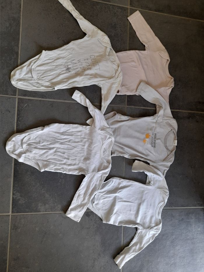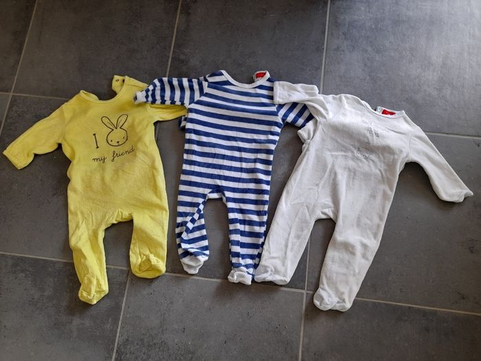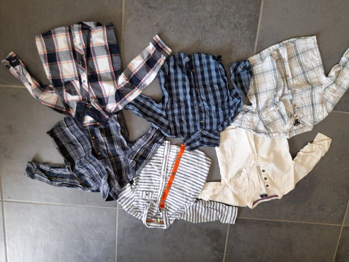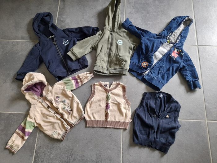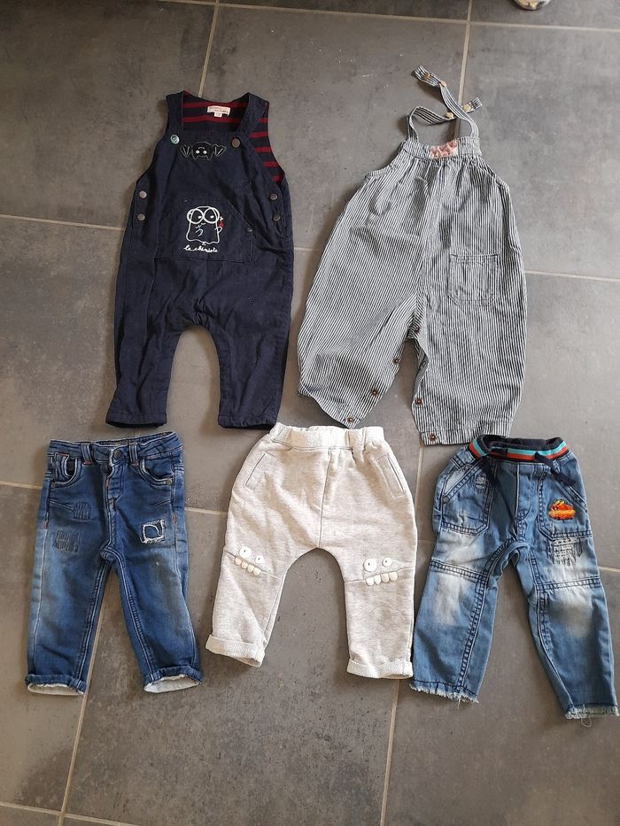 Caisse de vêtements garçon en 12 mois comprenant: 2 ensembles pomette (salopette grise et t shirt rayé) et obaibi (jean et t shirt moutarde ) 2 salopettes 2 jeans et 1 jogging gris, 5 bodies manches longues 3 pyjamas 4 t shirts manches longues 6 chemises 3 vestes à capuche 1 gilet à capuche et 2 pulls sans manches.
