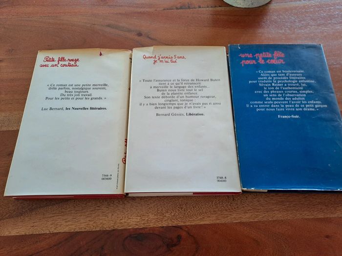 Lot de 3 livres. - Quand j'avais 5 ans je m'ai tué de Howard Buten - Une petite fête pour le coeur de Silvain Reiner - Petite fille rouge avec un couteau de Myrielle Marc Éditions France Loisirs. Bon état. Les couvertures papier sont un peu passées avec le temps et des traces sur la tranche du haut ( voir photos ) mais l'intérieur de livres est impeccable.