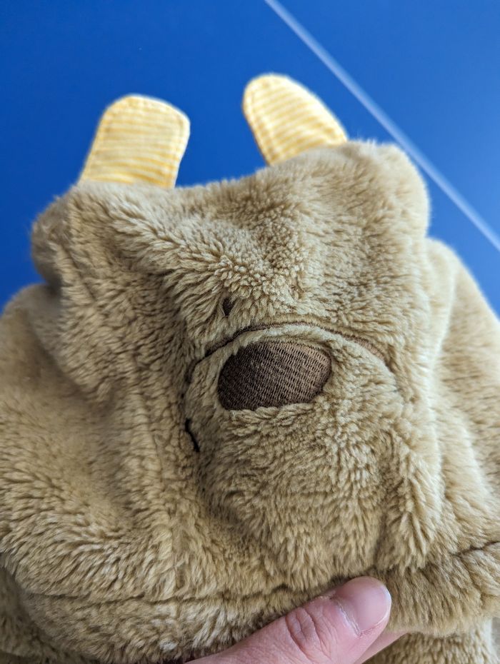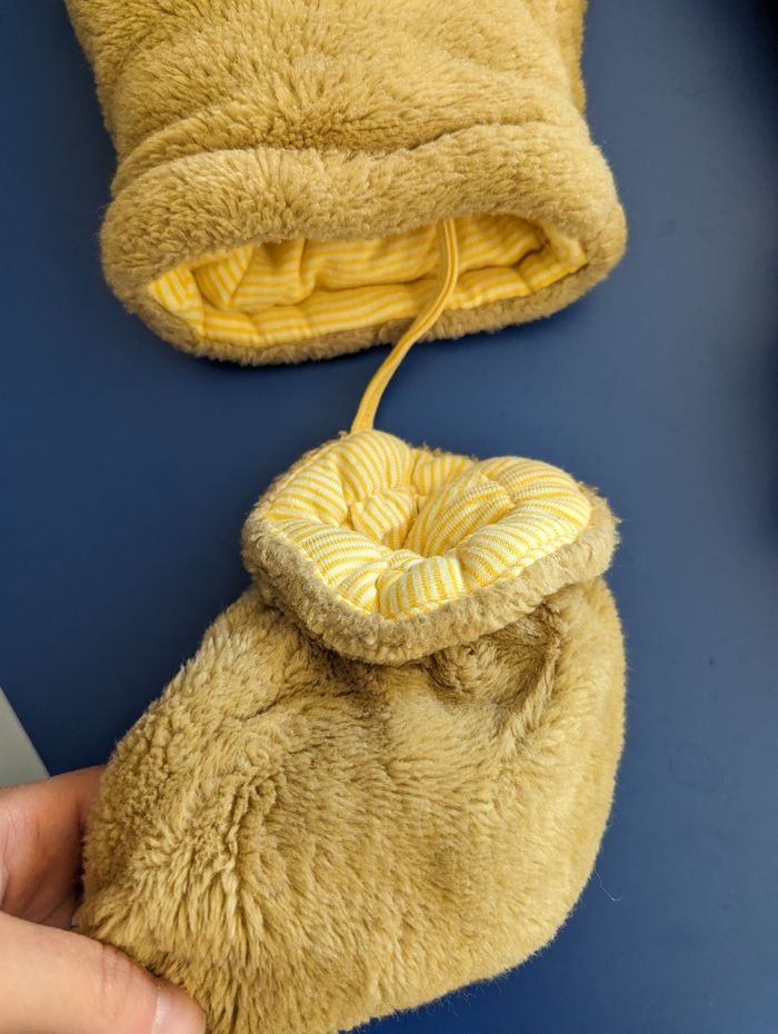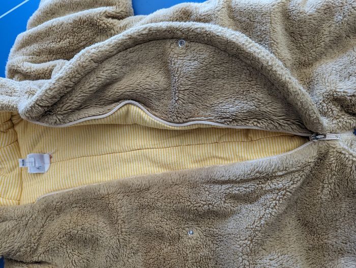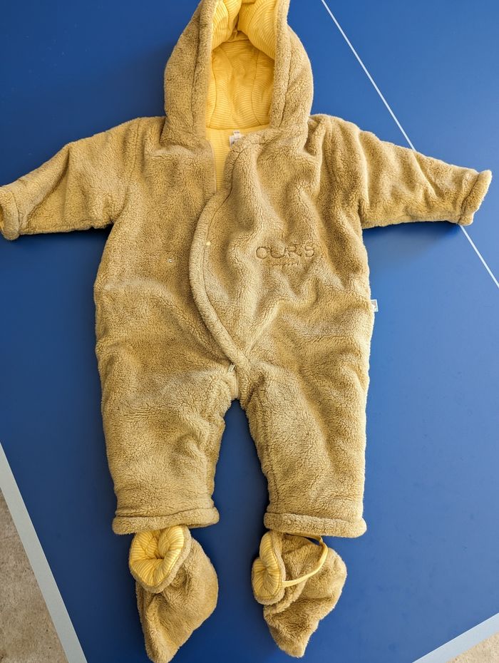 Combinaison effet peluche très chaude. Avec petits chaussons et capuche à oreille. En très bon état. 1 an / 74 cm