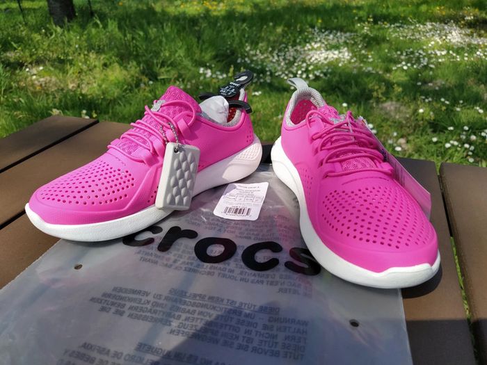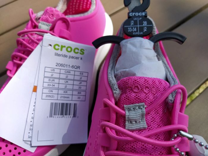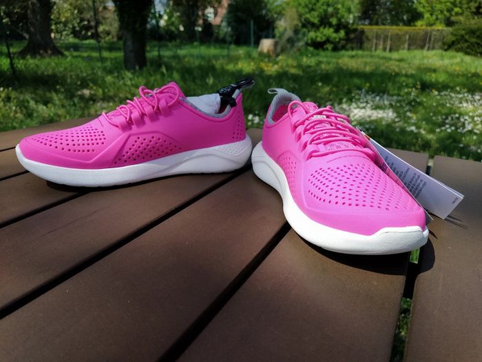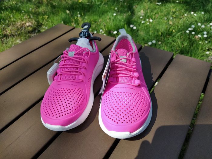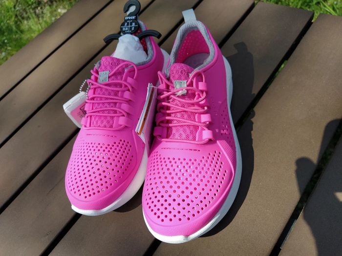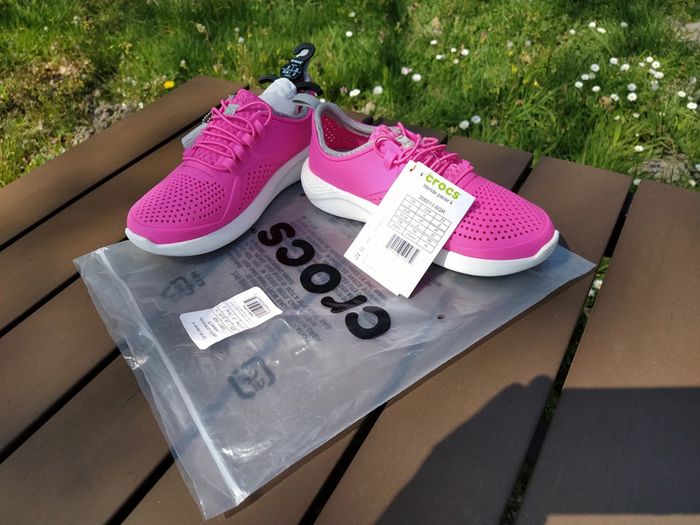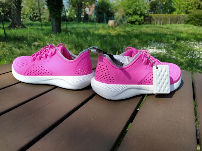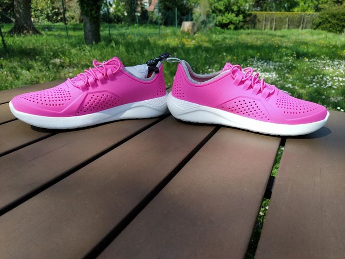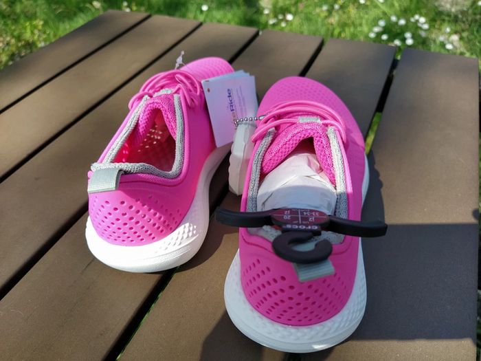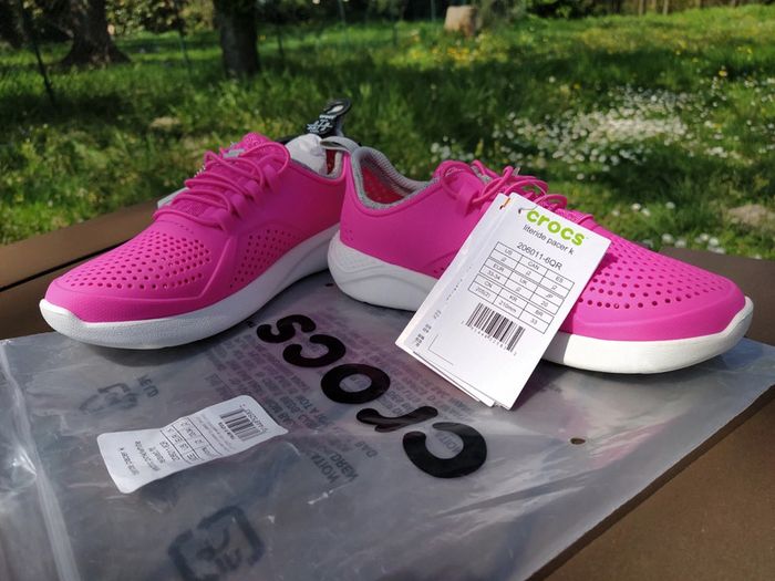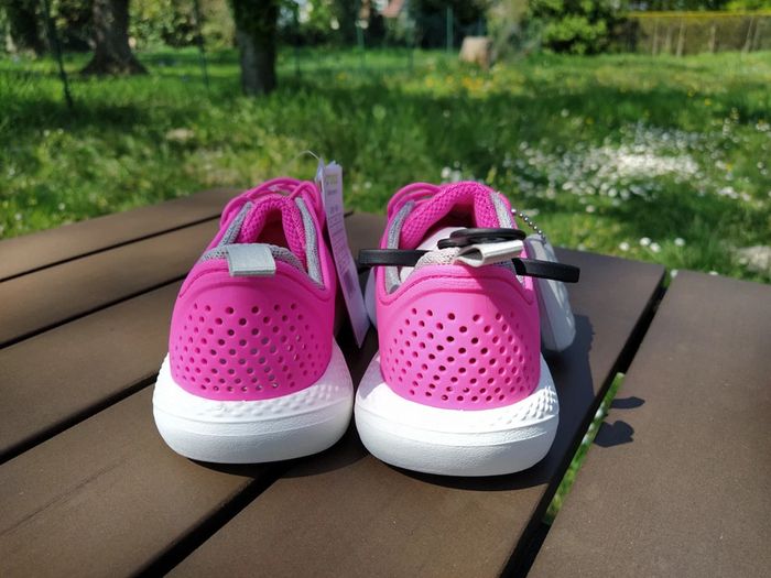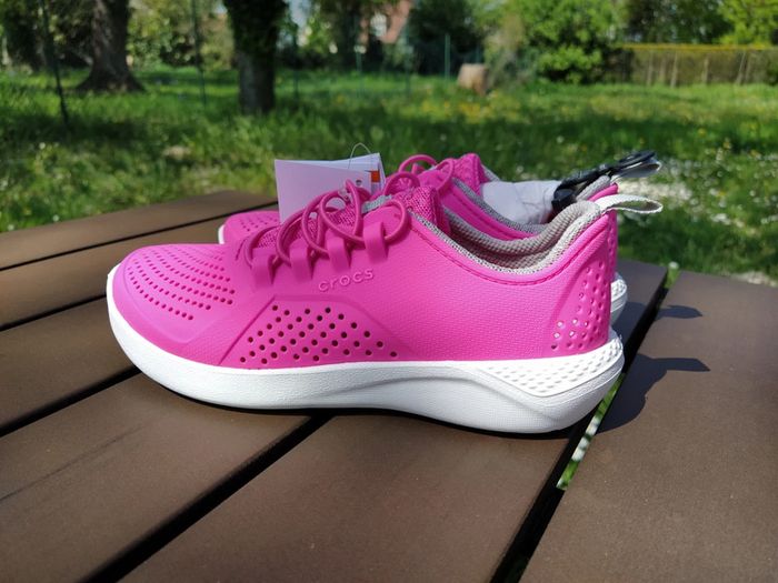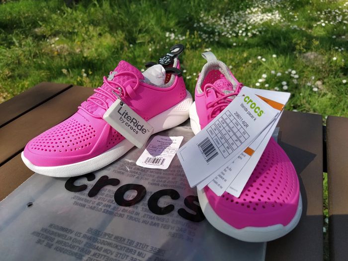 Crocs Sneakers Low Baskets hyper légère à lacets élastiques. Coloris rose électrique et blanc. D’inspiration sportive pour un mode de vie actif. Semelle intérieure en résine LiteRide™ légèreté incroyable et résistance remarquable. Semelle extérieure en Croslite™ Hyper confortables. Adaptées à l'intérieur/extérieur et activités aquatiques. Idéal plage, bord de mer, bateau ⛵ 🌊🌅 Taille J2 - 33/34 Neuf, avec étiquette et emballage, jamais portées. Achetées l'été dernier trop grandes en prévision et aujourd'hui... Trop petites... 🤦 Prix neuf d'achat : 49.90€ Prix vendu : 28€ Le modèle n'est plus disponible sur le site.