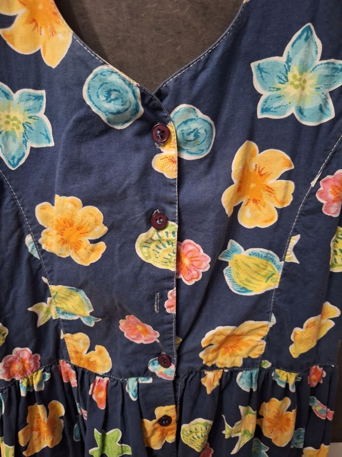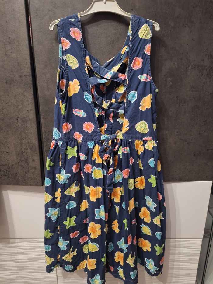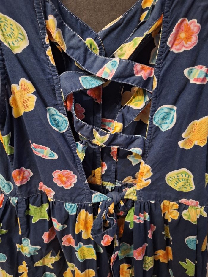Jolie robe sans manches bleu marine motifs fleuri et poissons multicolores, boutonnée devant, dos entrelacé avec liens à nouer, marque illisible, taille 14 ans, portée mais en très bon état