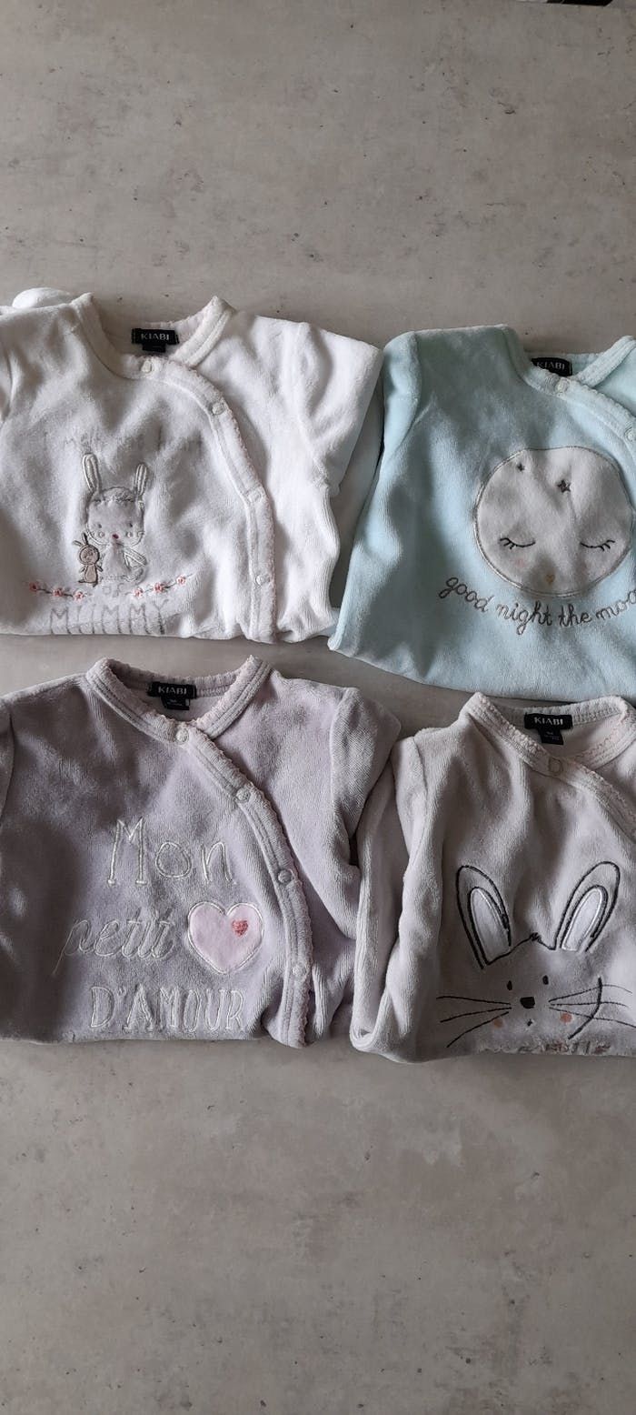 lot 4 pyjama velours 1 mois de Kiabi. Quelques signes d'utilisation au niveau du cou 1er bouton pour certains mais en très bon état.