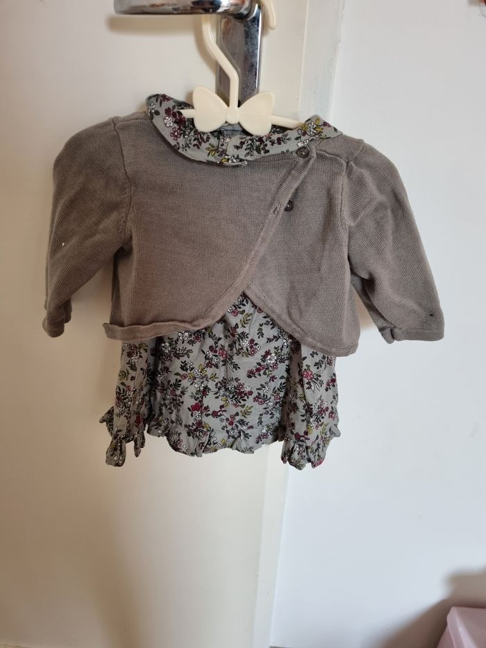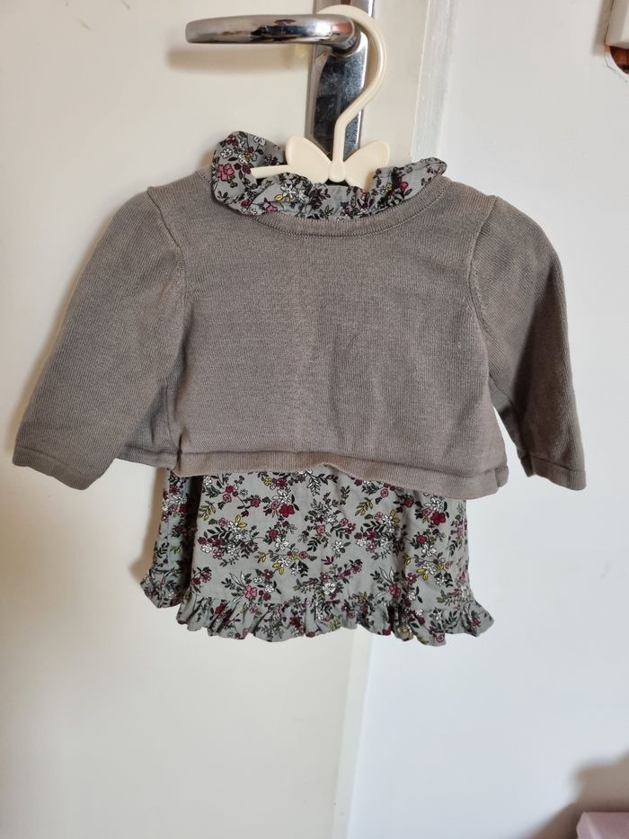 Ensemble robe à pression dans le dos avec col volanté. Gilet qui se ferme derrière avec boutons. 6 mois, 68cm.