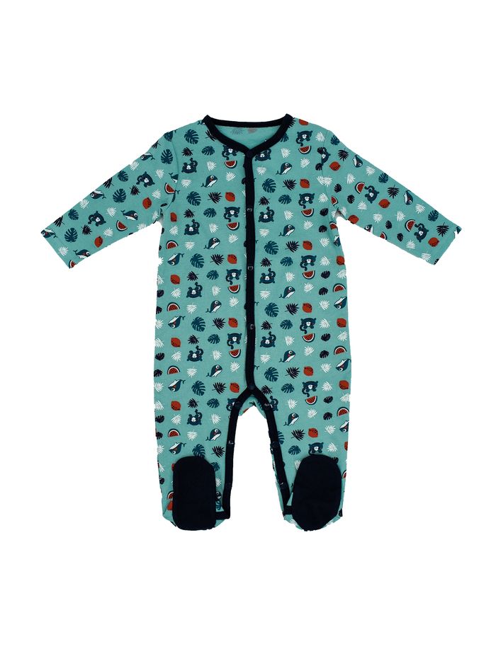 Un dors bien en jersey pour garçon parfait pour l'été en imprimé jungle. - Pyjama en jersey 'DOO&BO' - 100% coton - Col rond - Manches longues - Ouverture par pressions devant - Imprimé all over jungle - Avec pieds et biais contrastés