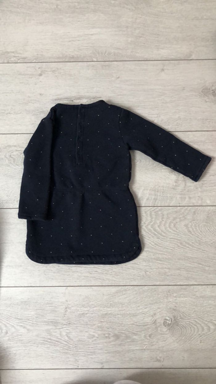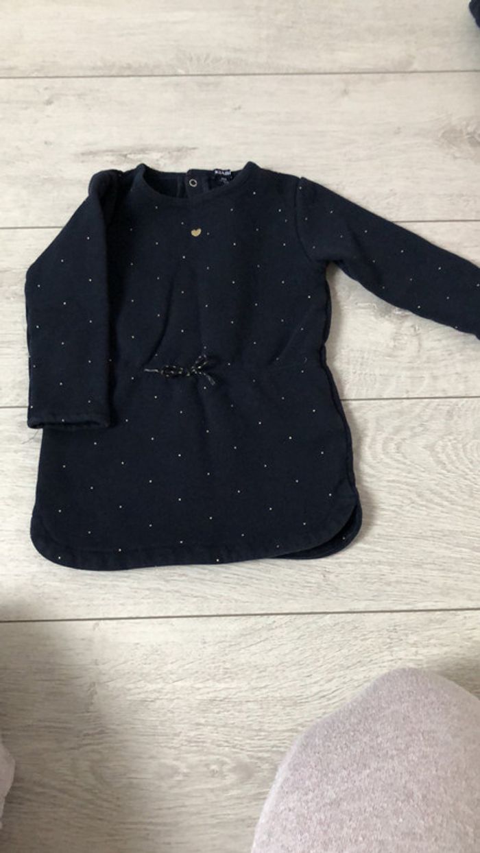 Bonjour je vends une robe bleu marine avec des petits points dorés et le petit cœur à l’état neuf en 18 mois de la marque kiabi