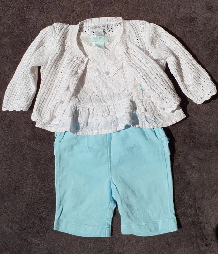 Ensemble 3pieces Orchestra Taille 1 mois Tunique sans manche toute brodé Caleçon 3 volants sur l'arrière Gilet maille ajoutée Excellent état