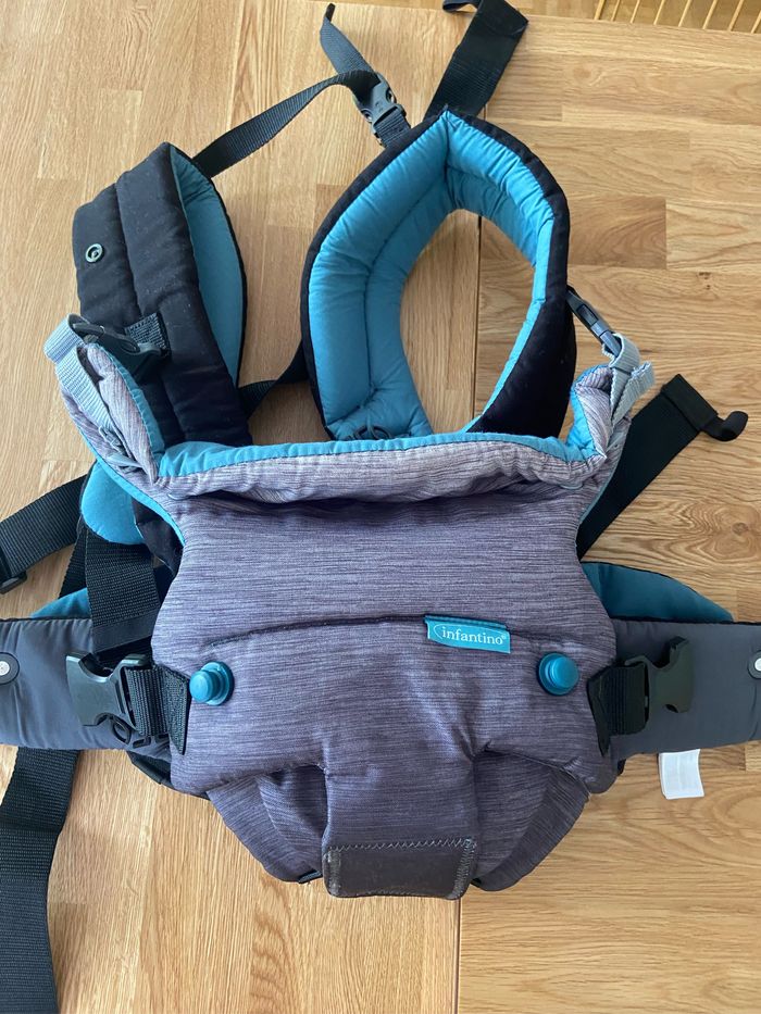 Porte bébé infantino. Dès la naissance jusqu’à 18 kilos. Permet de porter bébé dans plusieurs positions (ventre contre ventre, dos contre ventre, sur le dos). Il a peu voir pas du tout servi car on m’en a offert un autre.
