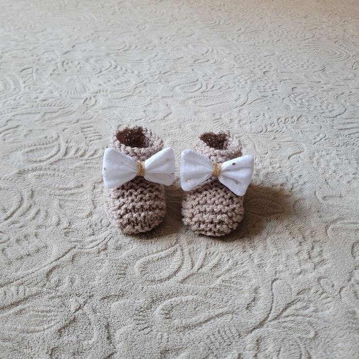 Chaussons tricot taille 0/3mois beige avec nœuds double gaze blanc à pois dorés. Neufs