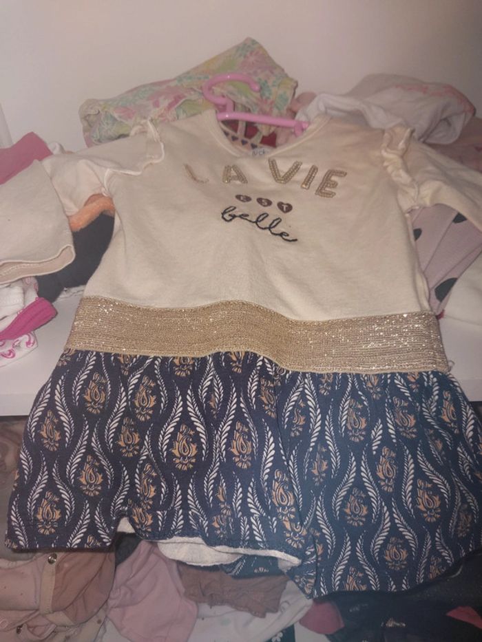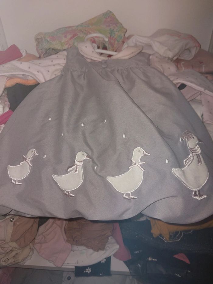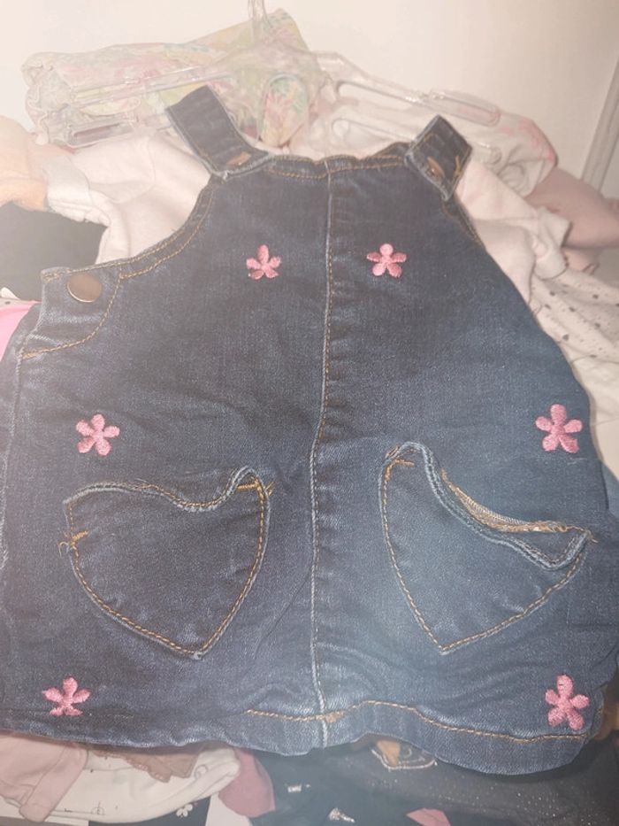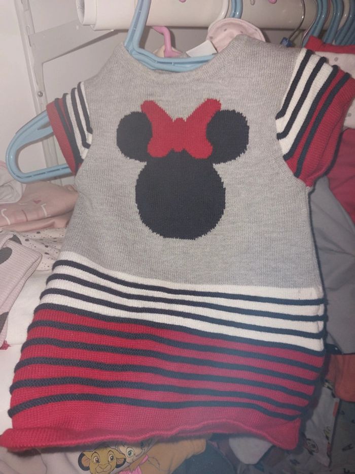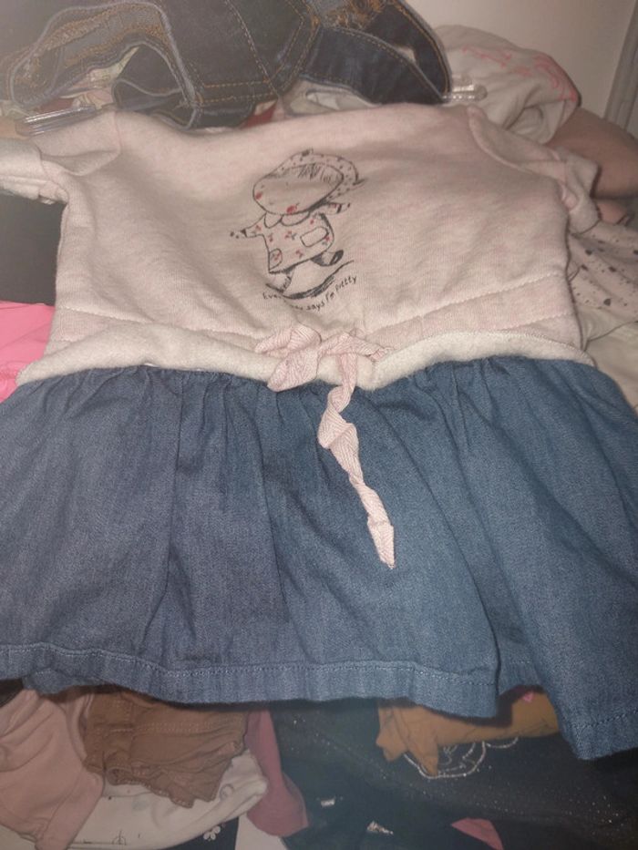 Robes 3 mois 1 robe pull sans manche 1 robe salopette jean 1 ensemble 3 pieces avec robe sous pullceh collants assortis 1 robe beige et bleu avec bandeau 1 robe pull minnie 5 euros le lot ou 1.50 euros pieces