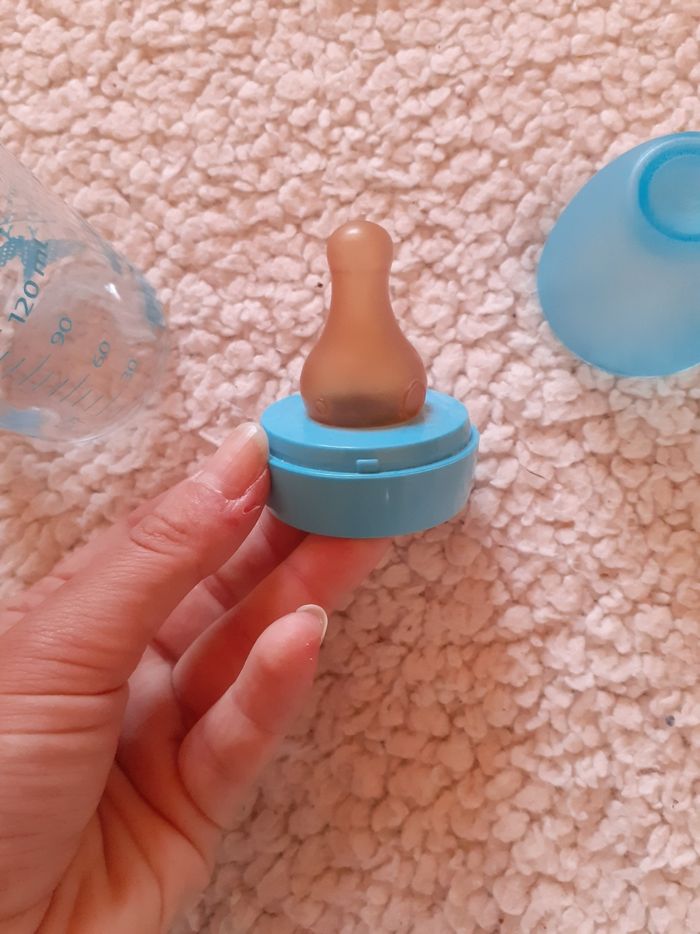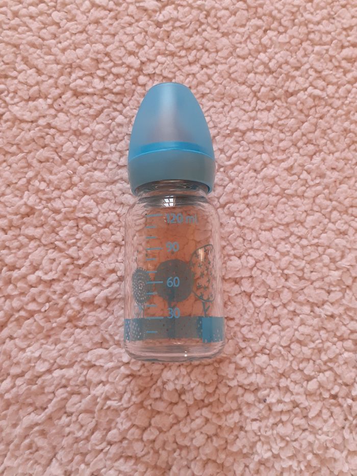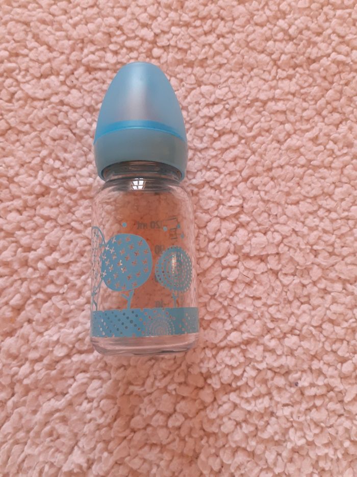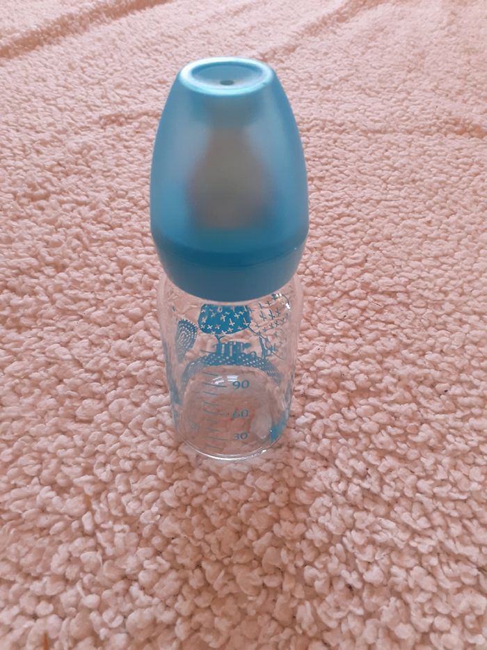 Petit biberon en verre 120 ml Tétine jamais utilisée, juste stérilisée Biberon utilisé uniquement pour faire chauffer l'eau au chauffe biberon (car les biberons que j'utilisais n'étaient pas en verre et trop large pour le chauffe biberon) Très bon état