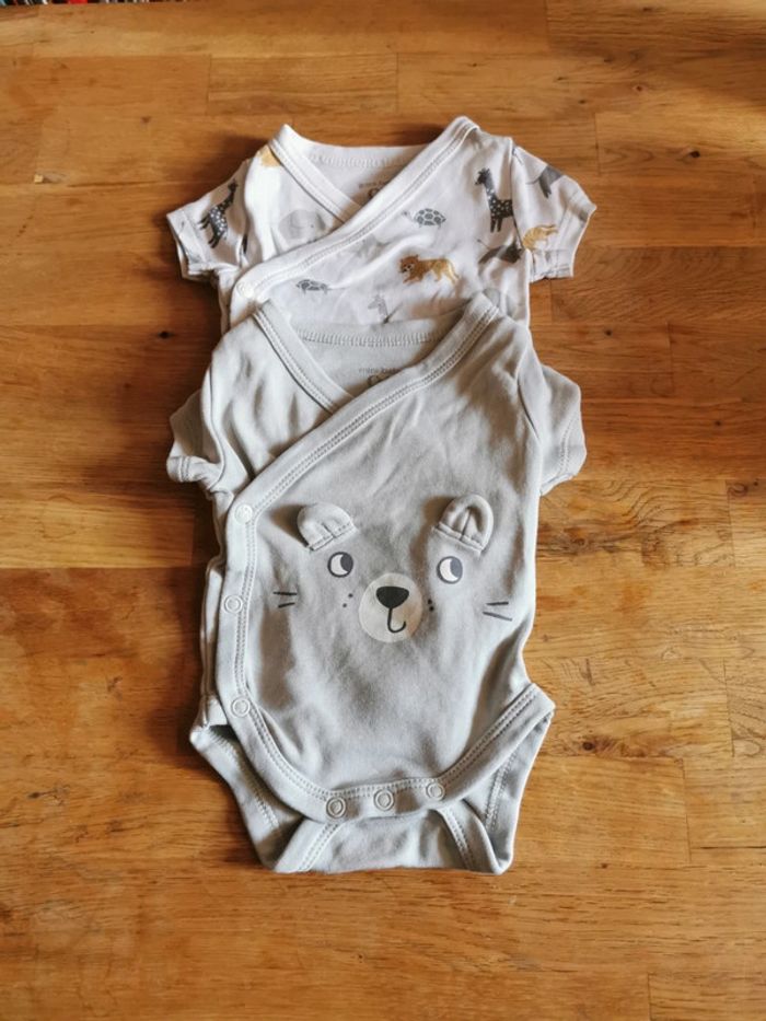 Marque C&A Taille 0-1mois 56cm Lot 2 bodys - 1 blanc avec des animaux de la savane - 1 gris clair motif ourson