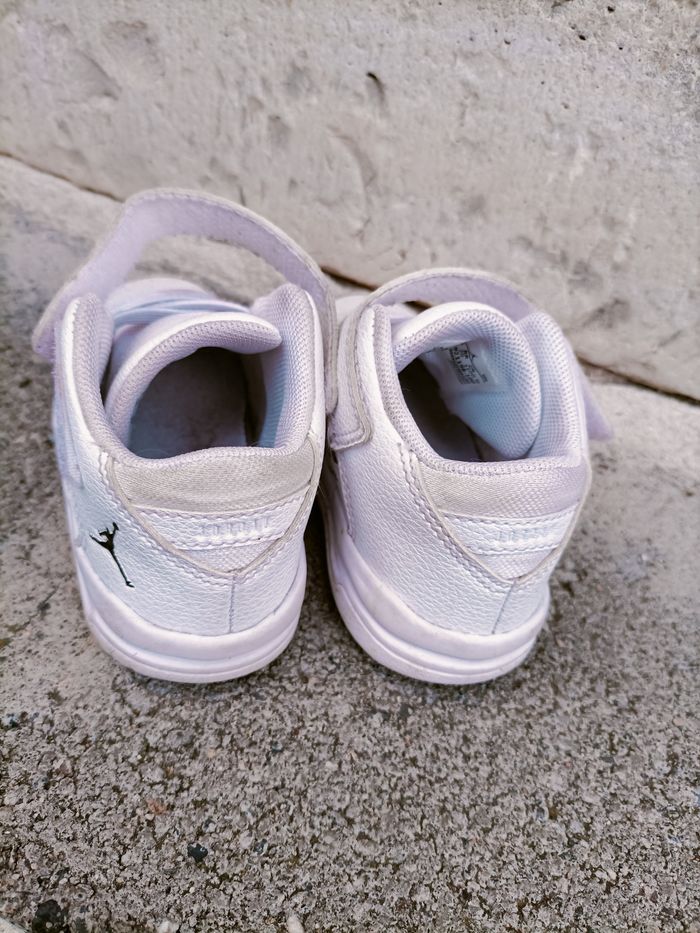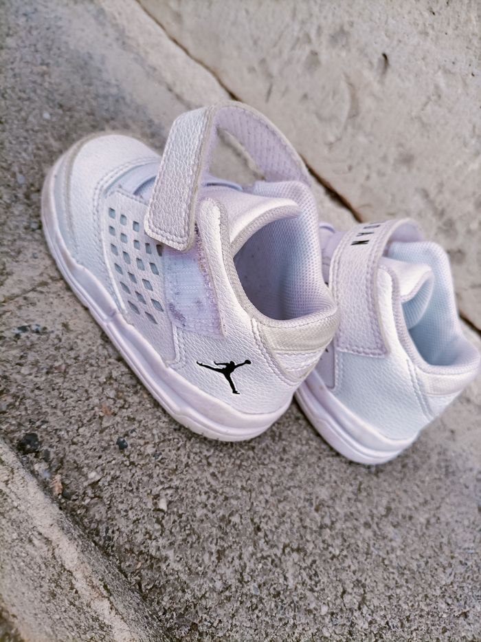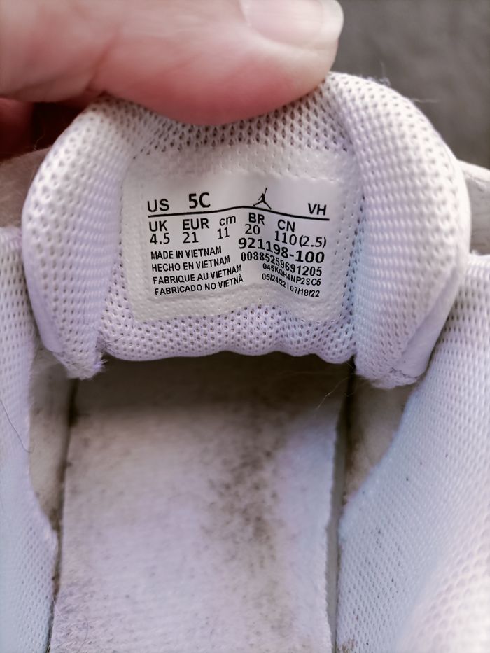 Nike Jordan blanche en bon état, la semelle intérieure n'est pas très propre. Derrière le tissu en haut est un peu jaunâtre. Taille 21