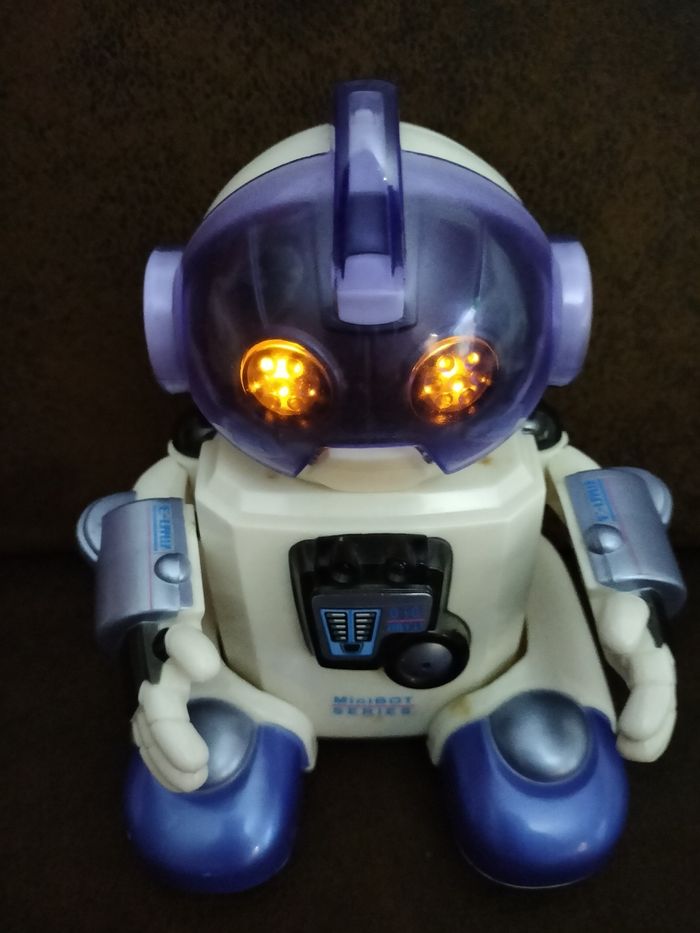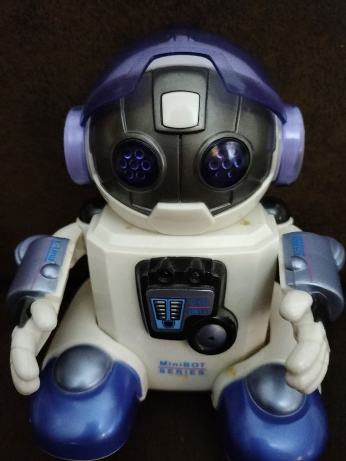 Petit robot . Effets sonores et avance du côté de vos applaudissements et avance vers vous . Effets sonores et lumineux quand il avance. Visière mobile . Le capteur lumineux sur son corps lui permets d'éviter les obstacles. Marche avant ,droite et tourne en cercle . Marque minibot series Hauteur 15 cm 5€