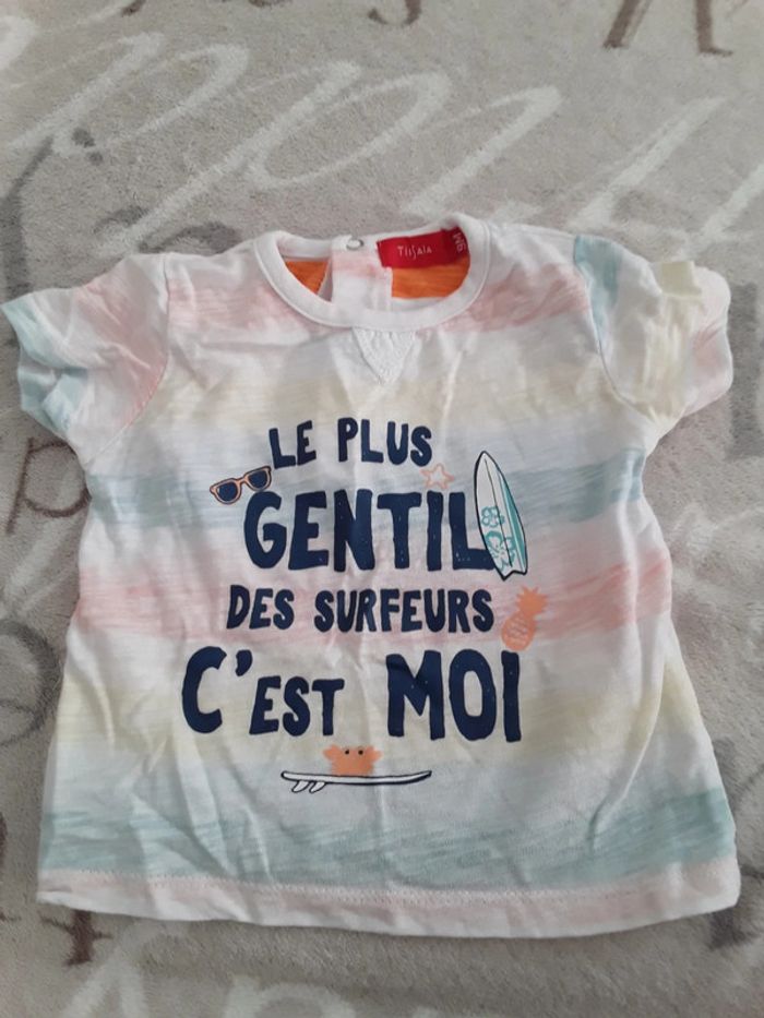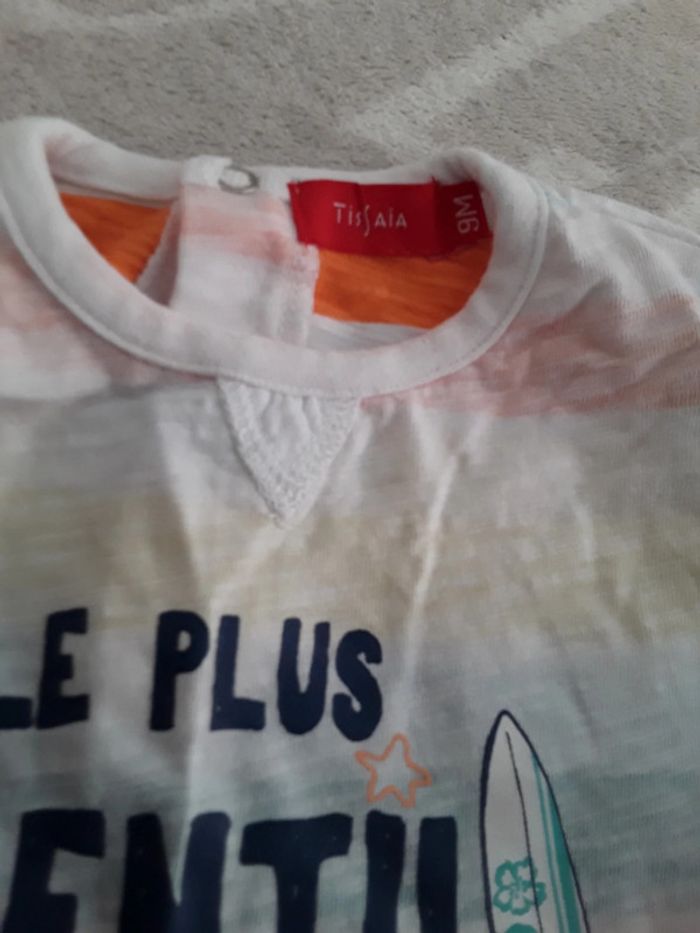 Tshirt Tissaia neuf sans étiquette, taille 9 mois, motif estival, blanc et coloré, lave 1 fois.